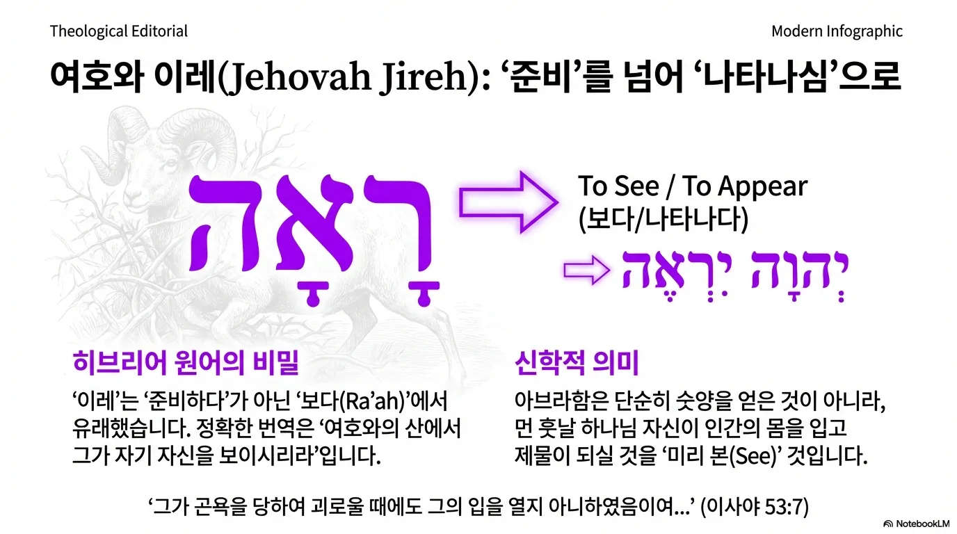 우리는 흔히 아브라함이 숫양을 발견하고 외친 '여호와 이레'를 "하나님이 준비하신다"라고 알고 있을 것이다. 물론 의역으로는 틀린 말은 아니다. 그러나 히브리어 원문을 직역하면 훨씬 더 충격적인 진실이 숨어 있다. '이레'는 '보다'라는 뜻의 동사 '라아'에서 왔기 때문이다. 고로, 창세기 22장 14절의 정확한 번역은 "여호와의 산에서 그가(여호와가) 자기 자신을 보이시리라"이다.