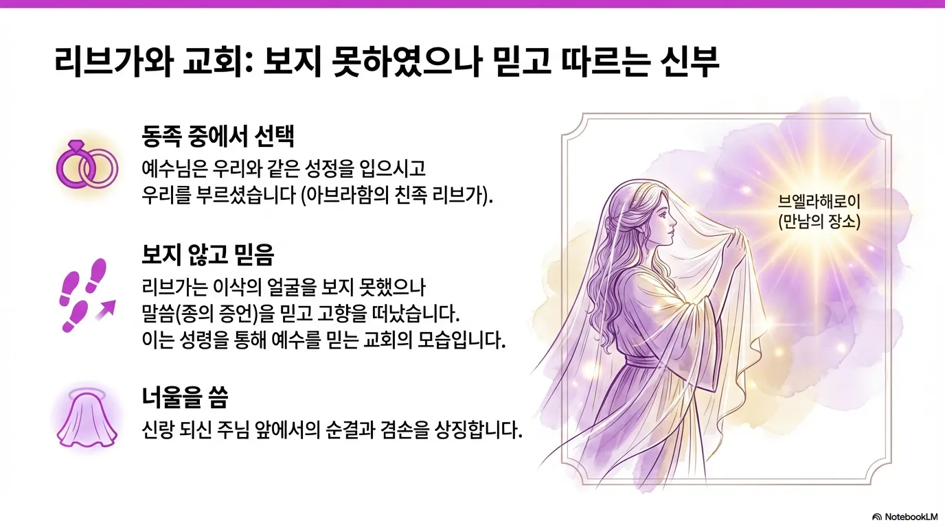 그런데 리브가는 얼굴 한 번 보지 못한 이삭의 이름만 듣고도 기꺼이 고향을 떠나 길을 나선다. 이것은 오순절 성령 강림 이후, 예수 그리스도를 눈으로 보지 못했으나 성령의 증언과 기록된 말씀을 믿고 주님을 따르는 오늘날 교회의 모습과 일치한다. 리브가가 이삭을 만나자마자 너울을 써서 자신을 가린 것은, 남편 되신 그리스도 앞에 그를 머리로 인정하는 순결하고 겸손한 교회의 정체성을 그대로 보여준다.