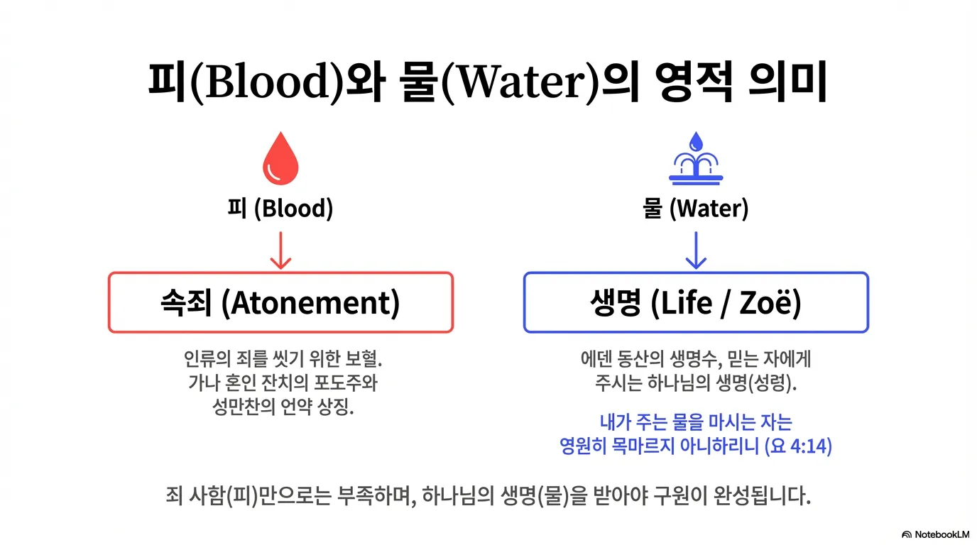 그렇다면 예수께서 그날 흘리셨던 피와 물은 대체 무엇을 의미하는 것인가? 여기서 '피'는 기본적으로 예수께서 가나 혼인 잔치의 기적 속에서 말씀하셨고, 성만찬의 말씀 가운데에서도 언급했듯이, 그것은 바로 그분이 인류의 속죄를 위해 흘리는 피를 의미한다. 그렇다면 물은 무엇을 의미하는가? 그것은 생명을 의미한다. 왜냐하면 하나님의 보좌로부터 생명수가 흘러나와서 생명강을 만들었고, 그 생명강의 물이 떨어져서 에덴동산의 생명나무에 물을 공급해 주었기 때문이다. 그런데 첫 사람 아담의 범죄로 에덴동산의 생명나무는 다시 하늘로 올라가버리고 말았다. 대신 아버지로부터 생명을 가지고 이 땅에 들어오신 분이 계셨으니, 그분이 바로 하나님의 아들이자 사람의 아들이신 우리 주 예수님이시다. 그러므로 그분 안에는 생명이 들어 있었던 것이다. 그것의 표상이 바로 '물'이었던 것이다. 그러므로 예수께서는 니고데모의 대화속에서도 사람이 물과 성령으로 거듭나지 아니하면 하나님의 나라에 들어갈 수 없다고 말씀하셨다(요3:5). 그리고 사마리아의 여인과의 대화에서도 당신이 영원히 목마르지 아니할 생수를 그녀에게 줄 수 있다고 말씀하신 것이다(요4:13~14).