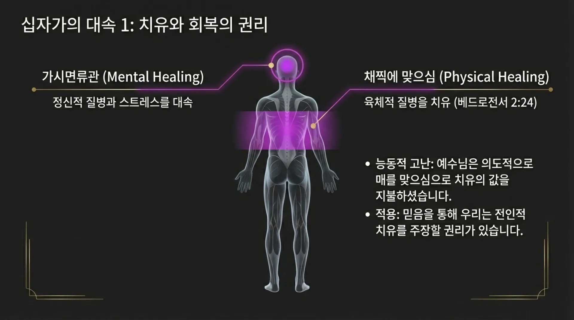 첫째, 그날 예수께서 머리에 가시면류관을 쓰시고 온 몸에 채찍에 수없이 맞으신 것은 우리를 질병에서 낫게 하기 위함이었다(벧전2:24). 사실 예수께서 그날 대속의 죽음만을 위해 죽으셨다면, 아무런 고난 없이 그냥 죽임만 당하시면 되었다. 왜냐하면 죄의 삯은 사망이기 때문이다. 다시 말해, 죄의 삯은 고난당함을 포함하는 것은 아니었기 때문이다. 하지만 예수께서는 그날 두 번씩이나 엄청나게 채찍으로 맞으셨다. 그리고 머리에는 가시면류관까지 쓰셨다. 그리하여 머리에서도 피가 흘러내렸고 온 몸에서도 살이 찢겨져서 피가 흘러내렸다. 그런데 예수님의 이러한 고난은 매우 특별한 것이었다. 왜냐하면 구약의 어떤 속죄제물도 채찍에 맞고 죽는다는 예표가 없었기 때문이다. 고로 우리 주님께서는 일부러 맞으신 것이라고 할 수 있다. 그것은 그분의 머리에 가시면류관을 쓰심으로 우리를 정신적인 질병에서 해방하게 위함이었고, 채찍에 맞으심으로 육체적인 질병에서도 해방하려 함이었기 때문이다(사53:5, 벧전2:24, 출23:25~26). 그분의 십자가에서 고난받으심은 또 하나의 예언에 대한 성취되였던 것이다. 고로 지금도 예수님을 믿는 자들 중에는 기적적으로 병에서 낫는 자들이 있다.