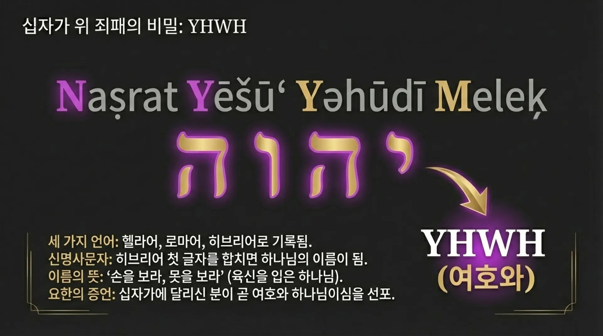 그렇다면 이 죄패가 어떤 의미가 있길래 이것을 성경책에 기록으로 남겨놓았는가? 그것은 예수께서 구약시대로 치자면 여호와이시다는 것을 가르쳐 주기 위함이요, 한 분 하나님이 육체를 입고 오셔서 십자가에서 손이 못에 박혀 죽으셨다는 것을 알려주기 위함인 것이다. 왜 그런가? 그것은 '나사렛 예수 유대인들의 왕'이라는 히브리어의 첫 글자를 다 합치면, 신명사문자러서 '여호와(야훼)'라는 단어가 되기 때문이다. 또한 이 신명 사문자의 사전적인 의미도 놀랍기만 하다. 그것은 '효오드 헤, 와우 헤'로서, '손을 보라. 못을 보라'라는 뜻이기 때문이다. 즉 십자가에 매달리신 분은 다른 분이 아니라 한 분 하나님이 사람되신 분으로서, 그분은 구약시대로 치자면, 여호와 하나님이시라는 것을 말한다. 더욱이 이 죄패는 여호와 하나님께서 육신을 입으실 것인데, 그때 그분이 누군지는 '손을 보고 못을 보면 알 수 있다'는 의미이기 때문이다. 그리하여 많은 유대인들이 훗날 예수님을 한 분 하나님이라는 것을 깨닫고 예수님을 믿게 된다.