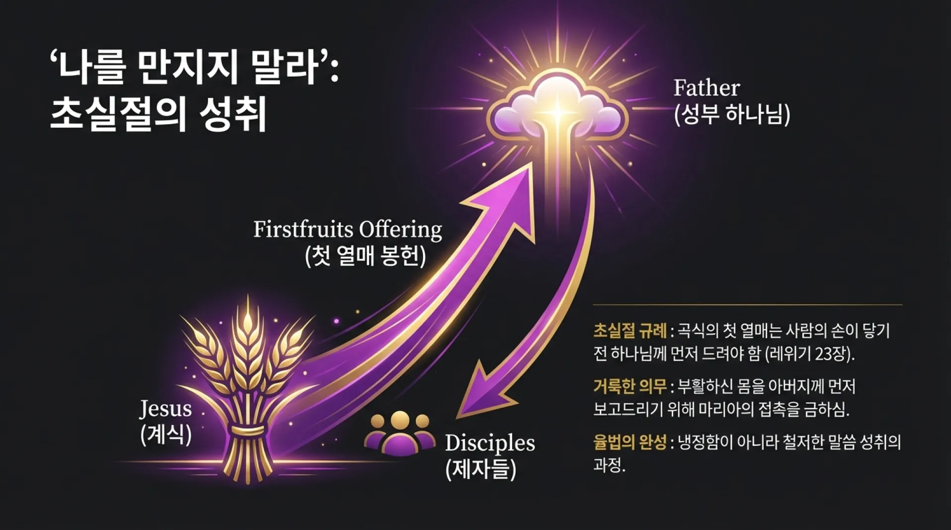 레위기 23장의 절기를 보면, 유월절과 무교절이 지나고 안식일 이튿날은 '초실절'이다. 초실절에는 곡식의 첫 이삭 한 단을 제사장에게 가져가 여호와 앞에 기쁘게 받으심이 되도록 흔들어 바쳐야 했다(요제). 예수님은 바로 그 '부활의 첫 열매(고전 15:20)'가 되셨다. 첫 열매는 사람의 손을 타기 전에 먼저 하나님께 온전히 드려져야 한다. 예수님은 지금 부활의 첫 열매로서, 자신의 부활을 하나님 아버지께 보고하고 드려야 할 거룩한 의무를 수행하러 가시는 중이었다. 그래서 마리아에게 잠시 붙잡는 것을 멈추라고 하신 것이다.
