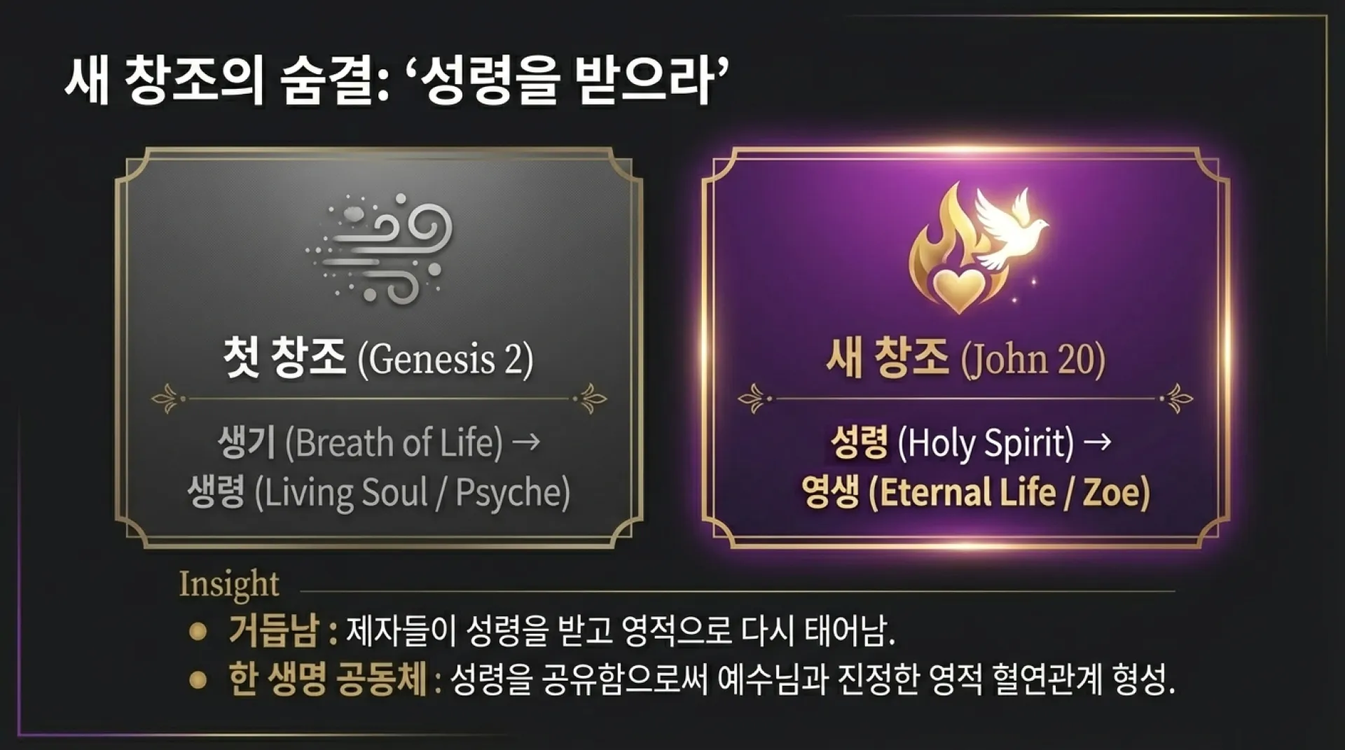 이 장면은 창세기 2장에서 하나님이 흙으로 빚은 사람에게 생기를 불어넣으시던 장면을 연상케 한다. 그러나 차원이 다르다. 창세기의 숨이 육체적 생명(푸쉬케)을 위한 것이었다면, 부활하신 예수님이 불어넣으신 숨은 영원한 생명(조에), 곧 하나님의 생명을 담은 성령이었다. 이 성령이 제자들 속에 들어감으로 인해, 그들은 비로소 '거듭남'을 경험하게 된다.