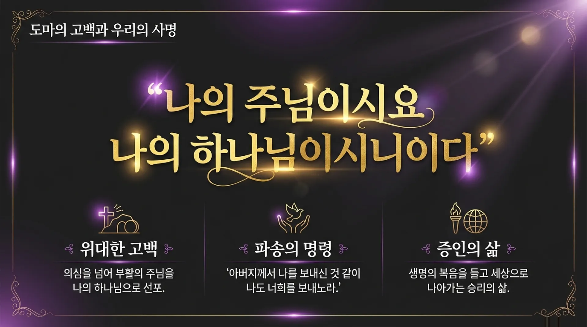 이 감격스러운 신분 변화를 안다면, 우리는 더 이상 세상의 위협 앞에 굴복하거나 죄의 유혹에 넘어질 수 없다. 도마가 부활하신 주님의 손과 옆구리를 확인하고 "나의 주님이시요 나의 하나님이시니이다"라고 고백했던 것처럼, 우리 또한 날마다 부활의 주님을 나의 하나님으로 고백하며 살아가야 한다. 그리고 주님이 아버지께서 나를 보내신 것 같이 나도 너희를 보낸다고 하신 것처럼, 우리 또한 세상으로 나아가 이 생명의 복음을 전하는 부활의 증인이 되어야 한다. 이것이 부활 생명을 가진 자의 마땅한 삶이다.