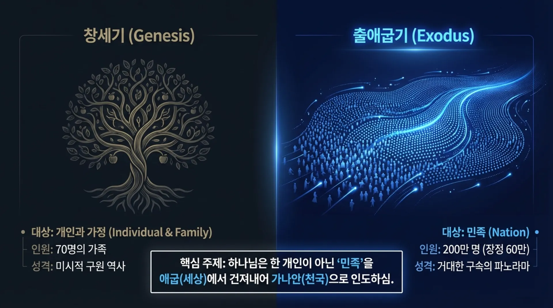 그런데 출애굽기에 들어서면 무대가 갑자기 바뀐다. 야곱의 70명 가족은 430년 만에 장정만 60만 명, 전체 200만 명이 넘는 거대한 민족으로 불어났다. 하나님은 이제 한 개인이 아니라, 하나의 '민족'을 애굽(세상)에서 건져내어 가나안(천국)으로 인도하시는 구속의 이야기를 전개하기 시작하신다.