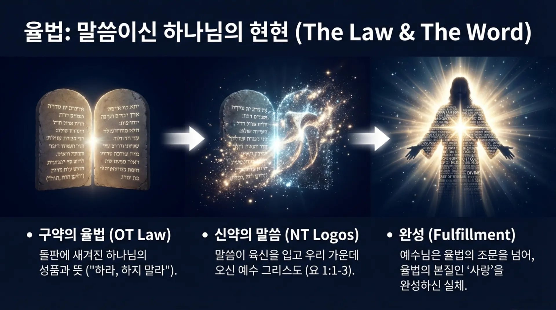 출애굽기 19장 이후 하나님은 시내산에서 모세에게 율법(언약의 말씀)을 주신다. 그 내용이 20장부터 24장까지 기록되어 있다. 이때 돌판에 새겨진 이 말씀은 하나님의 성품과 뜻을 보여주는 것이었다. 그런데 신약에 와서 이 말씀(Logos)이 육신을 입고 우리 가운데 나타나셨으니, 그분이 바로 예수 그리스도다(요 1:1-3). 구약의 율법이 "하라, 하지 말라"는 조문이었다면, 신약의 예수님은 그 율법의 정신인 사랑을 완성하신 실체이시다.