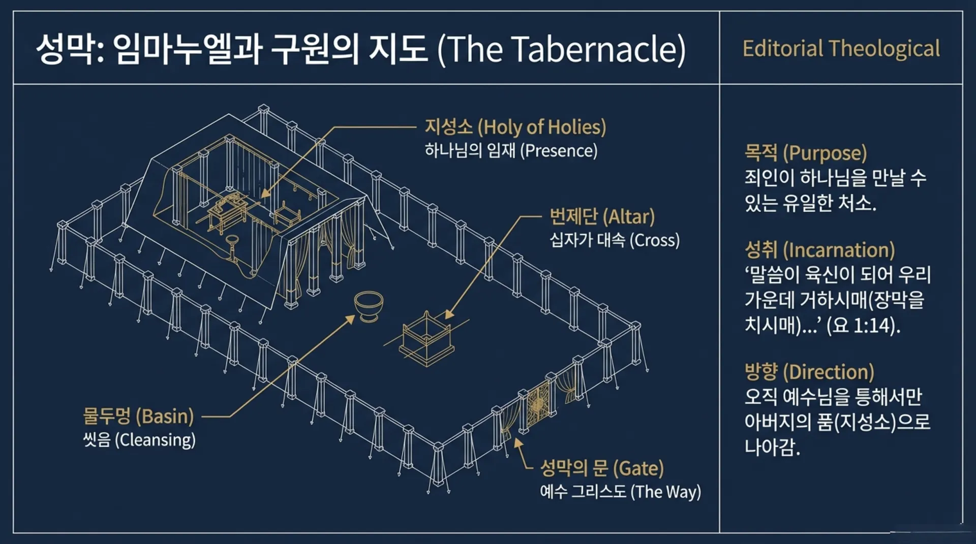 그랬다. 예수님은 이 땅에 오셔서 우리 가운데 장막(성막)을 치셨다(요 1:14, 계21:3). 이때 성막은 임시처소이지만 장차 천국은 하나님의 영원한 처소가 된다. 고로 출애굽기의 절반을 차지하고 있는 성막 전체 곧 성의 문, 번제단, 물두멍, 떡상, 등대, 분향단, 법궤 등 모든 기구는 예수님과 예수님의 사역을 예표한다고 할 수 있다. 유다지파가 진치고 있는 동쪽 문으로 들어가 번제단에서 죄를 씻고 지성소로 나아가듯, 우리는 오직 예수 그리스도를 통해서만(요 14:6) 아버지 품으로 들어갈 수 있다. 성막은 곧 예수님이시며, 그분을 통해 우리는 하나님과 동거하는 안식을 누리게 되는 것이다. 그러므로 성막은 우리 인간이 최종적으로 안식할 장소로서 천국을 예표하는 것이다.