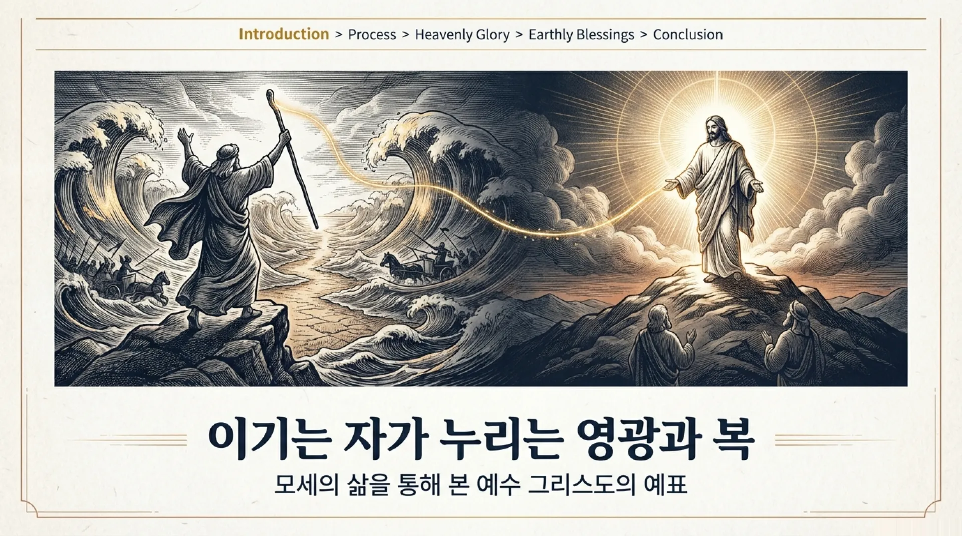 본 설교는 성경 인물 모세의 삶을 통해 영적 전쟁에서 이기는 자가 받는 축복의 실상을 기독론적 관점에서 설명합니다. 본 설교는 모세가 세상의 유혹, 권력에 대한 두려움, 이기심 등 다섯 가지 관문을 돌파함으로써 하나님과 친구처럼 대화하는 친밀함의 복과 기사와 표적을 행하는 권능의 통로가 되었음을 강조합니다. 특히 모세가 변화산에서 예수님과 인류의 구원을 논의한 사건은 그가 단순한 인물을 넘어 예수 그리스도의 예표이자 하늘 보좌실 회의에 참여하는 존귀한 존재임을 입증합니다. 결론적으로 이 설교는 성도들이 회개를 통한 영적 승리를 거둘 때 이 땅에서의 동행뿐만 아니라 천국에서 예비된 영원한 영광과 보상을 실제로 누리게 됨을 역설하며 신앙의 정진을 촉구합니다.