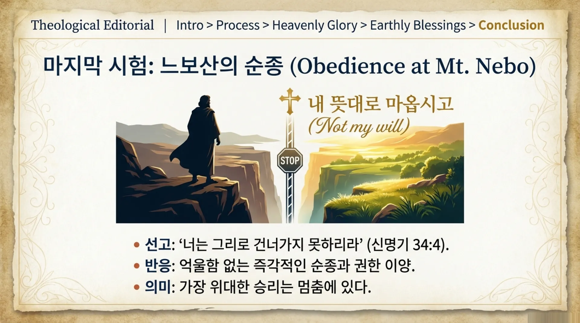 그러나 모세는 단 한마디의 불평이나 변명 없이, 하나님의 그 엄위하신 말씀 앞에 즉각적으로 순종했다. 자신이 비록 혈기를 부렸던 단 한 번의 실수로 인해 들어가지 못하게 되었을지라도, 하나님의 공의로운 판결 앞에 엎드리며 후계자 여호수아에게 모든 권한을 말없이 넘겨주었다. 끝까지 자신의 뜻을 고집하지 않고 하나님의 주권 앞에 모든 것을 내려놓는 이 눈부신 순종. 이것이야말로 십자가에서 "내 원대로 마시옵고 아버지의 원대로 되기를 원하나이다"라고 기도하셨던 예수 그리스도를 빼닮은 이기는 자의 찬란한 완성이다.