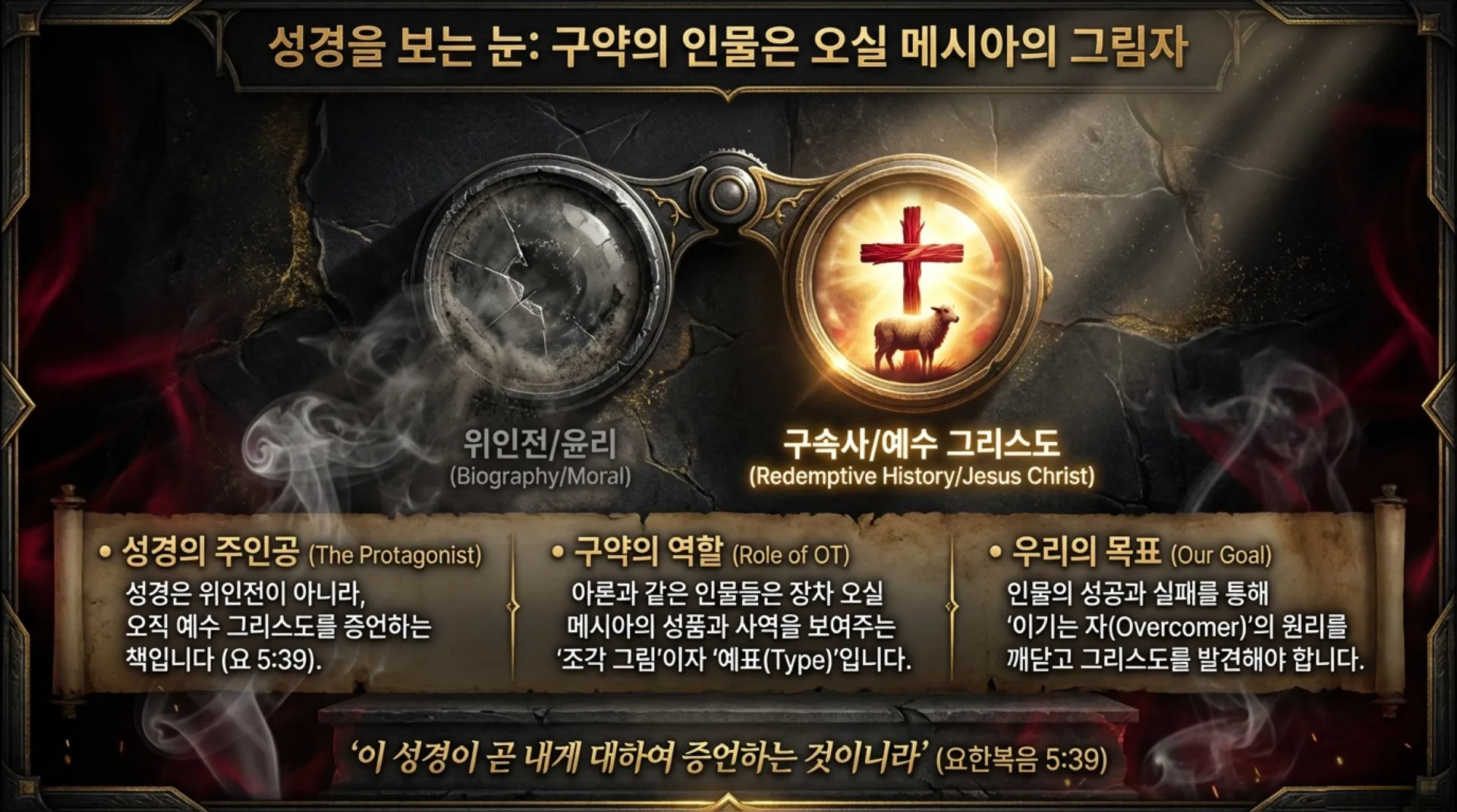 그래서 우리는 창세기의 족장 시대를 지나 출애굽기의 거대한 민족적 스케일 속에서 '이기는 자'의 모형을 추적하고 있다. 개인과 가족의 범주에서 영적 싸움을 감당했던 야곱과 유다, 요셉의 시대를 넘어, 이제 이스라엘은 바로 왕(사탄 마귀)의 압제를 끊어내고 가나안의 일곱 족속과 피 튀기는 전쟁을 치러야 하는 거국적인 영적 군대로 탈바꿈했다. 이 거대한 전쟁의 한복판에 예수 그리스도의 모형으로서 이스라엘을 이끌었던 세 명의 지도자가 등장한다. 모세와 아론, 그리고 여호수아(그리고 후대의 다윗)다. 그중에서도 이번 시간에 우리가 깊이 조명할 인물은 대제사장 '아론'이다. 흠 많고 연약하며 때로는 비겁하기까지 했던 아론이 어떻게 자신의 수치와 두려움을 극복하고, 산 자와 죽은 자 사이를 가로막아 서는 위대한 '이기는 자'로 거듭날 수 있었는지 그 치열한 영적 드라마 속으로 들어가 보자.