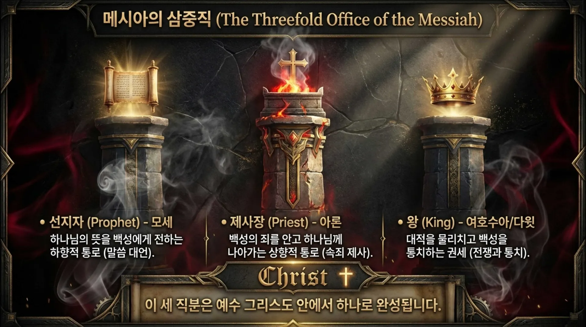그런데 이 세 가지 직분은 출애굽기 이후의 민족사 속에서 세 명의 굵직한 인물들을 통해 선명하게 예표된다. 첫째, '선지자'의 예표는 모세다. 그는 시내산에 올라가 하나님의 뜻을 직접 받아 백성들에게 오류 없이 대언하는 하향적 통로였다. 둘째, '대제사장'의 예표는 아론이다. 그는 짐승의 피와 향로를 들고 백성의 연약함과 죄악을 짊어진 채 지성소로 나아가는 상향적 통로였다. 셋째, '왕'의 예표는 여호수아다. 그러나 여호수아라는 과도기를 거쳐 훗날 다윗으로 완성된다. 다윗은 대적들을 물리치고 이스라엘에 태평성대를 가져다주며 하나님의 권위로 세상을 통치하는 전사요 왕이었다. 예수님은 이 땅에 오셔서 하나님의 말씀을 선포하시고(선지자), 자신을 단번의 제물로 드려 속죄하셨으며(제사장), 부활하사 만유를 통치하시는(왕) 이 세 가지 직분을 십자가에서 홀로, 그리고 완벽하게 성취하셨다.