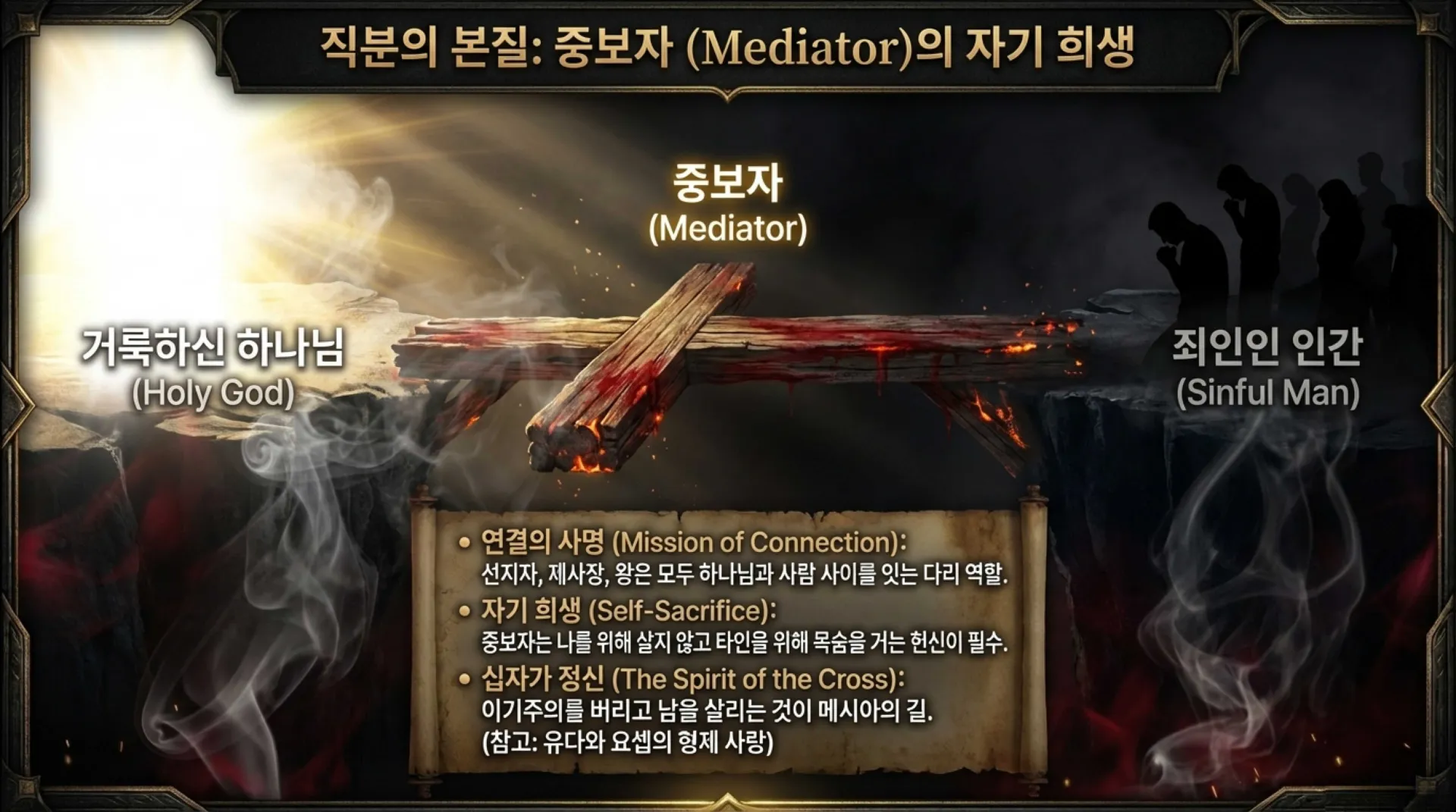 중보자는 결단코 자기 자신을 위해 존재하지 않는다. 선지자는 하나님의 진리를 전하기 위해 세상의 핍박과 조롱을 감내해야 했고, 제사장은 백성의 죄를 대속하기 위해 피비린내 나는 제단 앞에서 일평생을 헌신해야 했으며, 왕은 백성의 안위와 평안을 지키기 위해 전쟁터의 맨 앞에서 목숨을 걸어야 했다. 이처럼 중보자의 삶은 철저한 자기 희생이요, 타인을 위한 헌신이다.