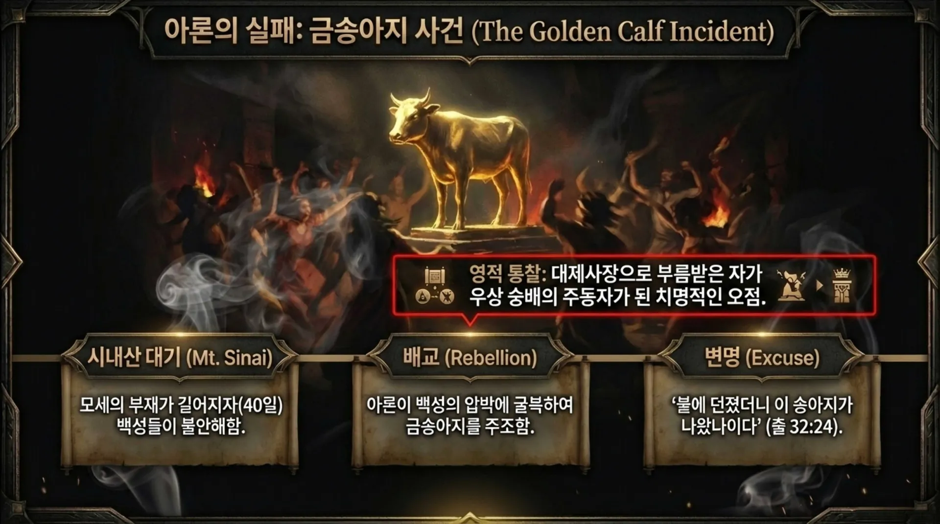 모세가 십계명을 받으러 시내산에 올라간 지 40일이 지나도록 소식이 없을 때였다. 백성들은 "우리를 인도할 신을 만들라"며 아론을 압박했고, 아론은 백성들의 금고리를 모아 송아지 우상을 주조했다. 곧 있으면 대제사장으로 기름부음 받을 자가 어떻게 이토록 치명적인 비겁함과 우상 숭배의 죄에 빠지게 되었던 것일까?