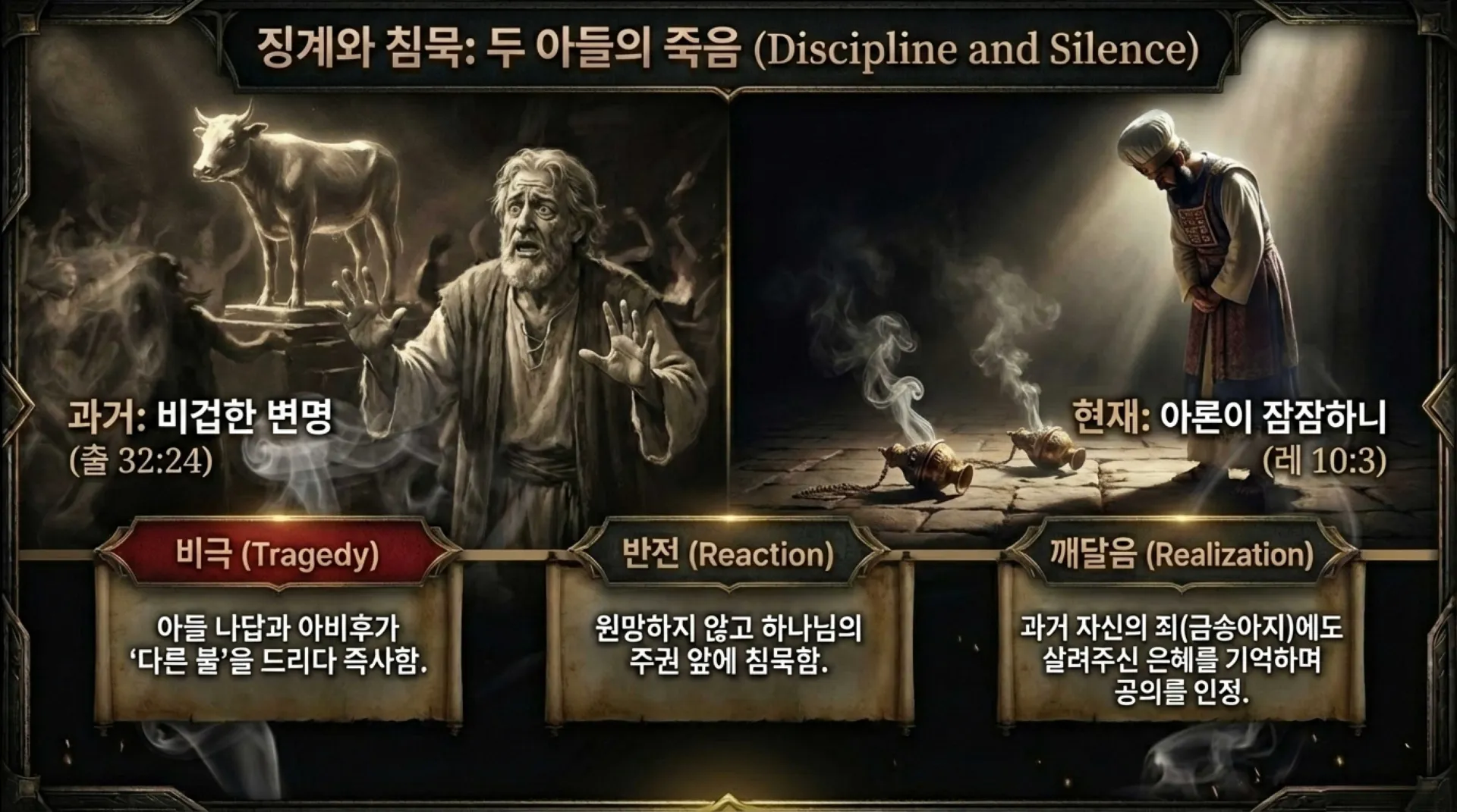 눈앞에서 두 아들이 까맣게 타 죽었다. 일반적인 아버지라면 가슴을 치며 하나님을 원망하고 모세에게 대들었을 것이다. 그러나 아론은 '잠잠했다'. 그는 우상을 만들어 이스라엘 전체를 멸망케 할 뻔했던 자신이 천 번 만 번 죽어 마땅한 죄인임에도 살려주신 하나님의 긍휼을 기억했다. 두 아들의 죽음이라는 피를 토하는 아픔 앞에서도 그는 하나님의 공의를 인정하고 모든 원망과 불평을 십자가에 못 박으며 철저히 침묵했다. 비겁했던 인간 아론이 내면의 혈기와 원망을 이겨내는 위대한 영적 승리의 순간이었다.