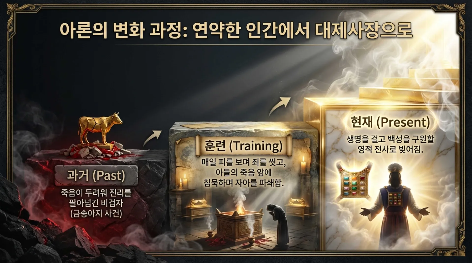 아론이 금송아지 사건의 수치를 안고 피 흘리는 제사장의 직무를 묵묵히 감당하며 결국 백성을 살려냈듯, 우리 역시 내게 주어진 고난과 환경을 탓해서는 안 된다. 내 안의 욕심과 음란, 혈기와 비겁함을 십자가 앞에 내어놓고 눈물로 회개할 때, 하나님은 우리의 뼈아픈 실패조차도 이웃을 살리고 생명을 잉태하는 위대한 사명의 도구로 역전시켜 주실 것이다.