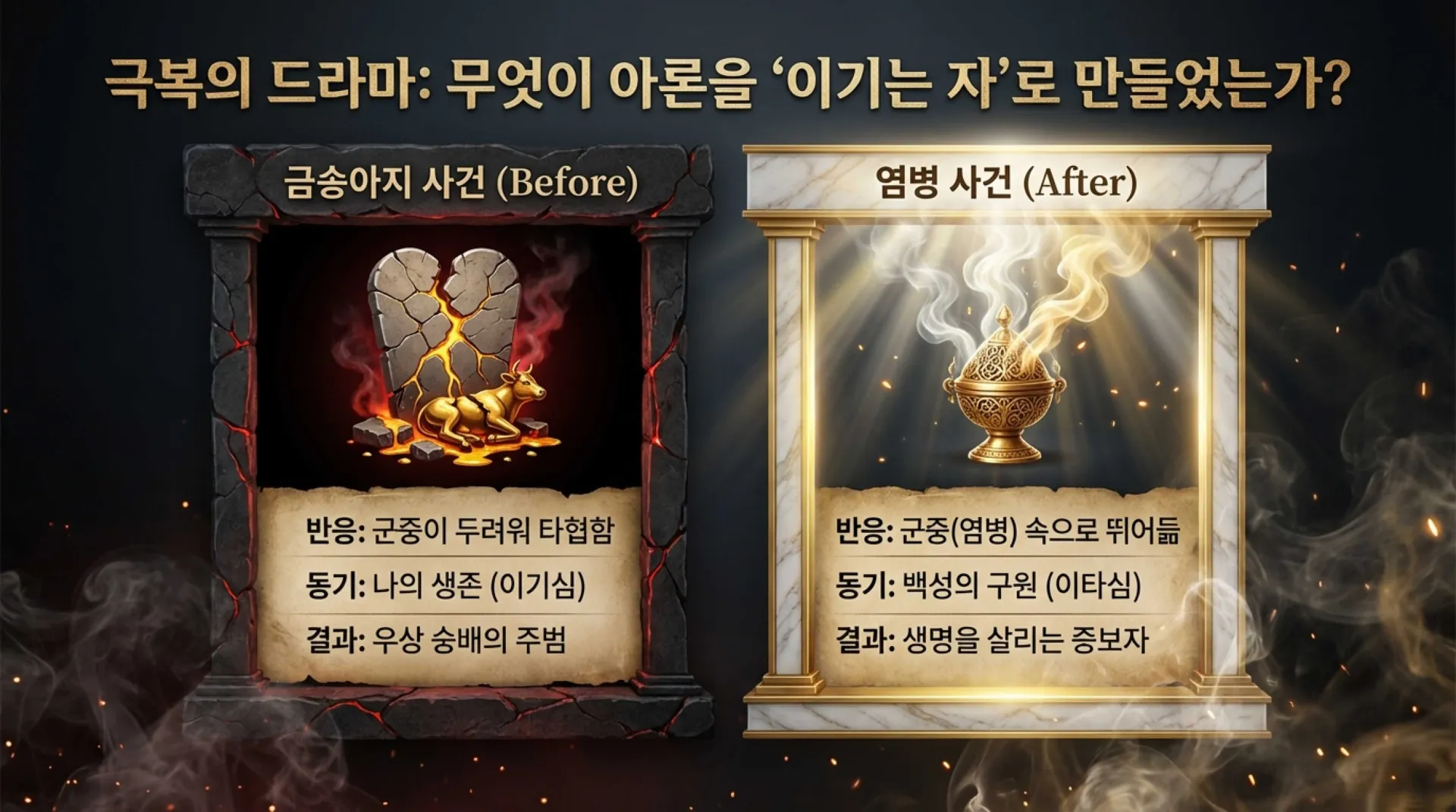 과거 금송아지 사건 때, 아론은 성난 군중의 돌에 맞을까 두려워 훌의 죽음을 방관하고 진리를 팔아넘겼던 비겁자였다. 그러나 이번에는 달랐다. 자신을 쳐 죽이려 했던 그 무서운 군중들을 향해, 아론은 번제단의 불을 담은 향로를 치켜들고 죽음의 염병이 창궐하는 그 지옥 같은 한복판으로 필사적으로 뛰어들었다. 산 자와 죽은 자 사이에 서서, 짙은 향연으로 하나님의 진노를 가리고 자신의 목숨을 던져 백성을 구원해 낸 것이다.