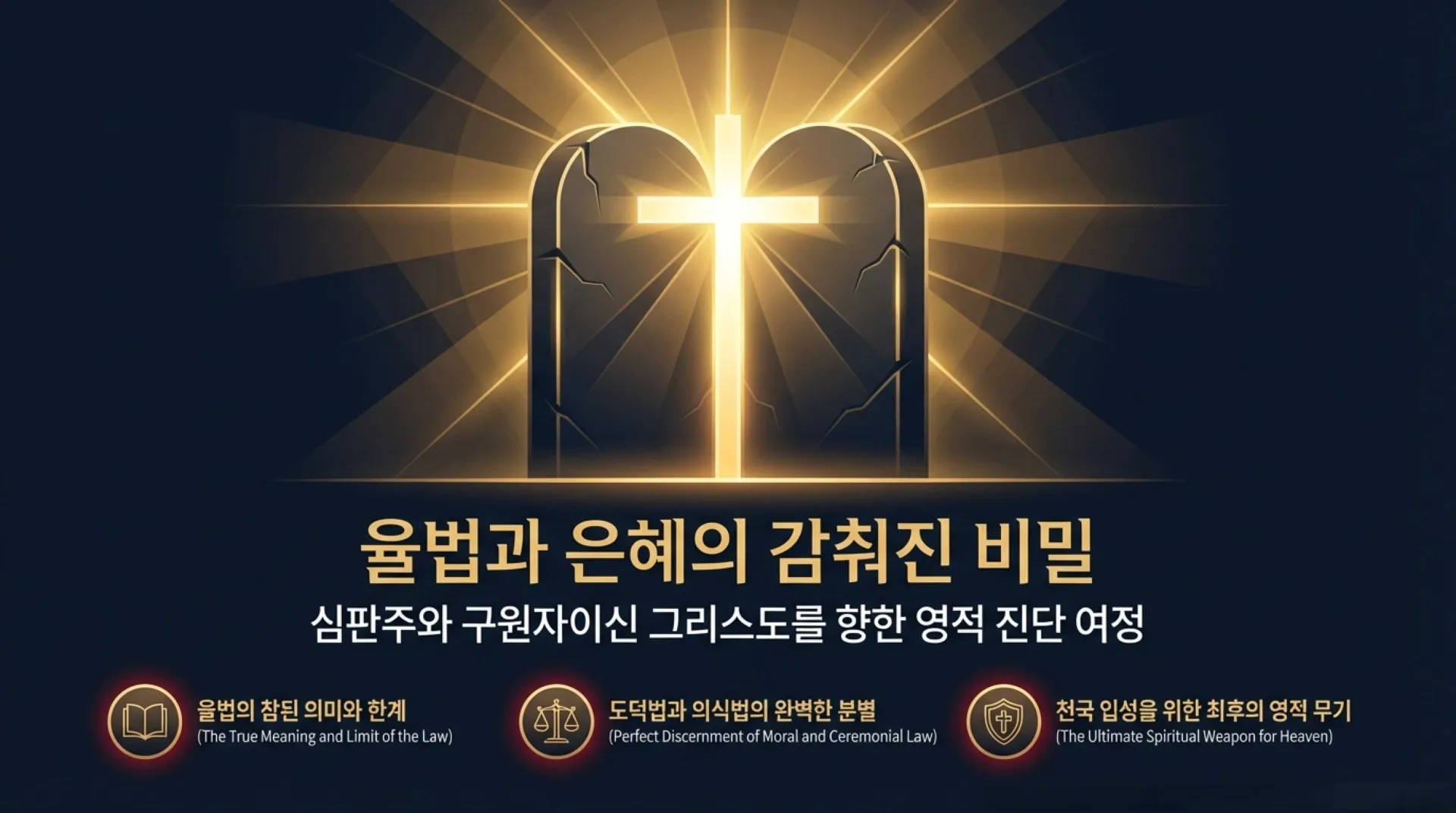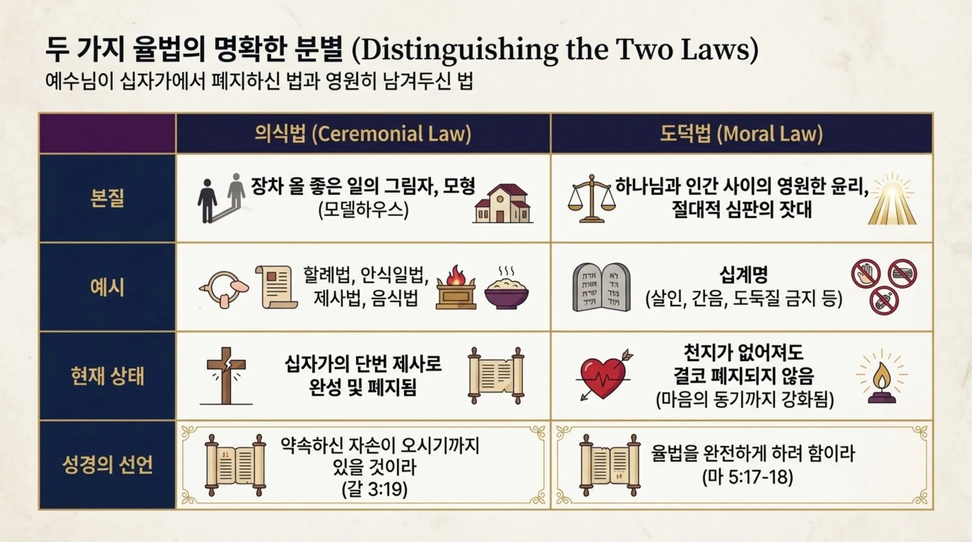 그러나 반대로, 천지가 없어져도 결코 폐지되지 않는 율법이 있으니 그것이 바로 ‘도덕법’, 즉 십계명이다. 십계명은 하나님과 인간, 인간과 인간 사이에 지켜야 할 영원한 윤리요, 장차 그리스도의 심판대 앞에서 우리의 선악을 달아볼 절대적인 심판의 잣대다. 예수님은 도덕법을 폐지하신 것이 아니라(마 5:17-19), 오히려 겉모양뿐이던 율법을 ‘마음의 동기’까지 심판하시는 완전한 차원으로 더욱 강화하셨다(마 5:27-28).