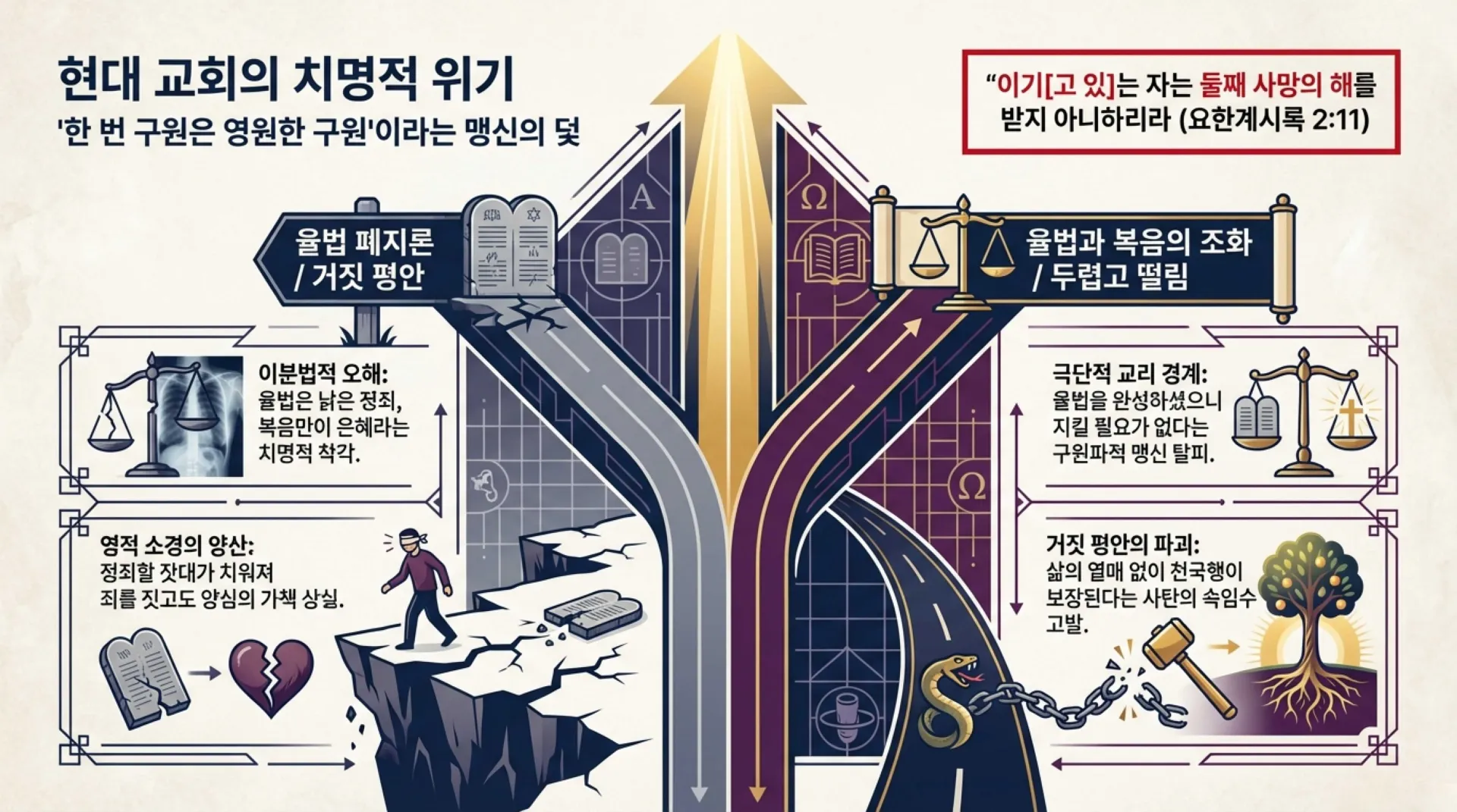 현대 교회를 깊이 병들게 한 가장 치명적인 영적 바이러스는 "한 번 구원은 영원한 구원이다"라는 교리와 그에 편승한 ‘율법 폐지론’이다. 많은 성도가 예수를 믿음으로 사망에서 생명으로 옮겨졌다는 (요 5:24) 말씀만을 굳게 붙든다. 물론 믿음으로 생명을 얻는 것은 구원의 위대한 출발점이다. 그러나 그들은 요한계시록이 경고하는 "이기[고 있]는 자는 둘째 사망의 해를 받지 아니하리라" (계 2:11)는 조건부의 진리는 철저히 외면한다.