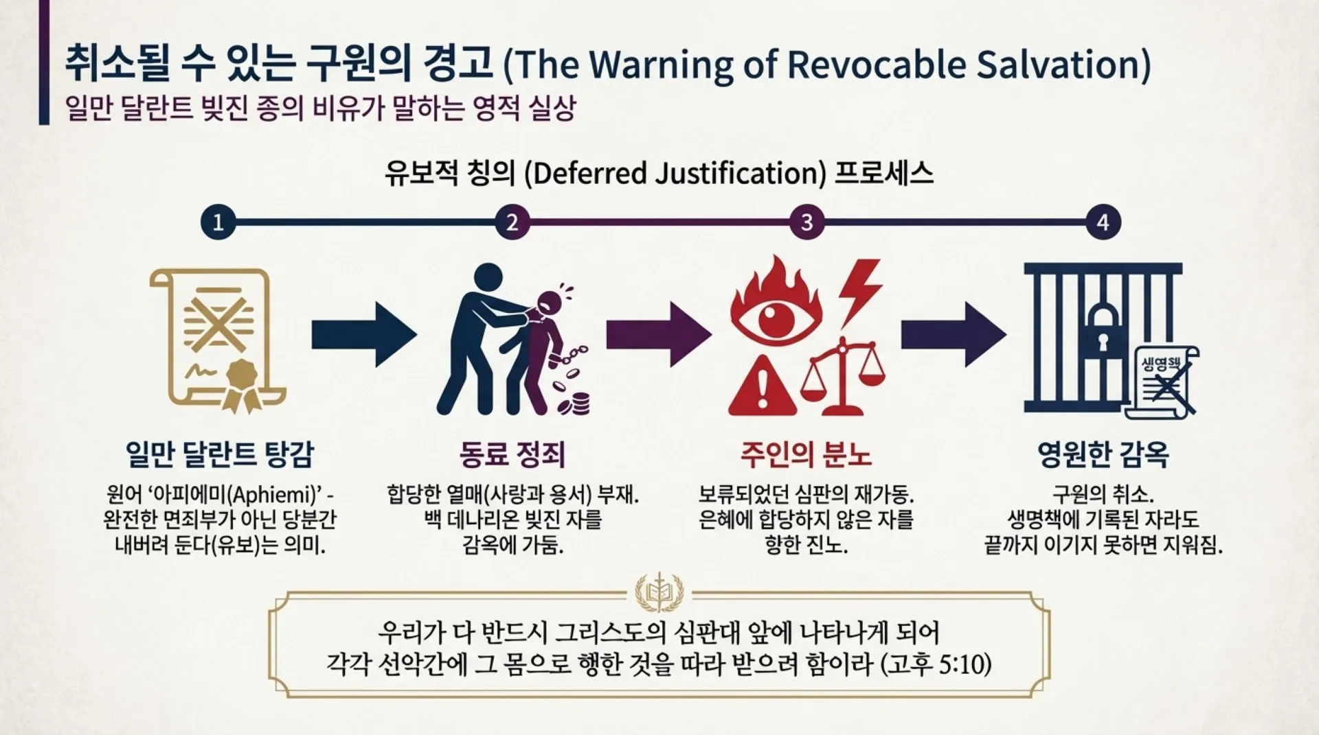 성경은 우리가 얻은 구원과 칭의가 결코 기계적인 영원불변의 상태가 아님을 분명히 경고한다. 마태복음 18장에 등장하는 ‘일만 달란트 빚진 종의 비유’(마 18:23-35)는 우리의 미래를 보여주는 소름 끼치는 영적 실상이다. 주인이 너무나 많은 빚을 져서 갚을 길 없는 종을 불쌍히 여겨, 그 어마어마한 빚을 ‘탕감’해 주었다. 여기서 탕감(용서)하다는 헬라어 원어 ‘아피에미(aphiemi)’는 ‘당분간 내버려 둔다, 유보한다’는 뜻을 지닌다. 그러므로 성도들이 받은 칭의는 완전한 면죄부가 아니라, 주님의 은혜에 합당하게 살기를 기대하시며 심판을 보류해 주신 ‘유보적 칭의’에 해당하는 것이다.