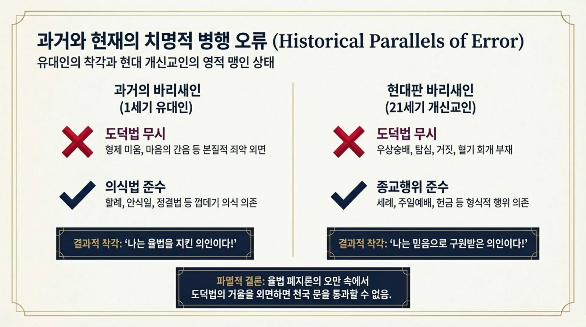 과거 유대인들은 이 율법의 구조를 오해하여 뼈아픈 착각 속에 빠져 살았다. 그들은 십계명의 참된 본질, 즉 형제를 미워하는 살인과 속으로 음욕을 품는 마음의 간음 같은 도덕법의 깊은 죄악들은 뻔뻔하게 외면했다. 그리고는 껍데기뿐인 의식법, 즉 난 지 8일 만에 할례를 받고 철저히 안식일을 지키며 부정한 음식을 피했다는 사실 하나만으로 자신들을 ‘의인’이라 여겼다. 모형에 불과한 의식법을 구원의 조건으로 착각한 채, 마음은 온갖 악독으로 가득했던 영적 소경들이었다.