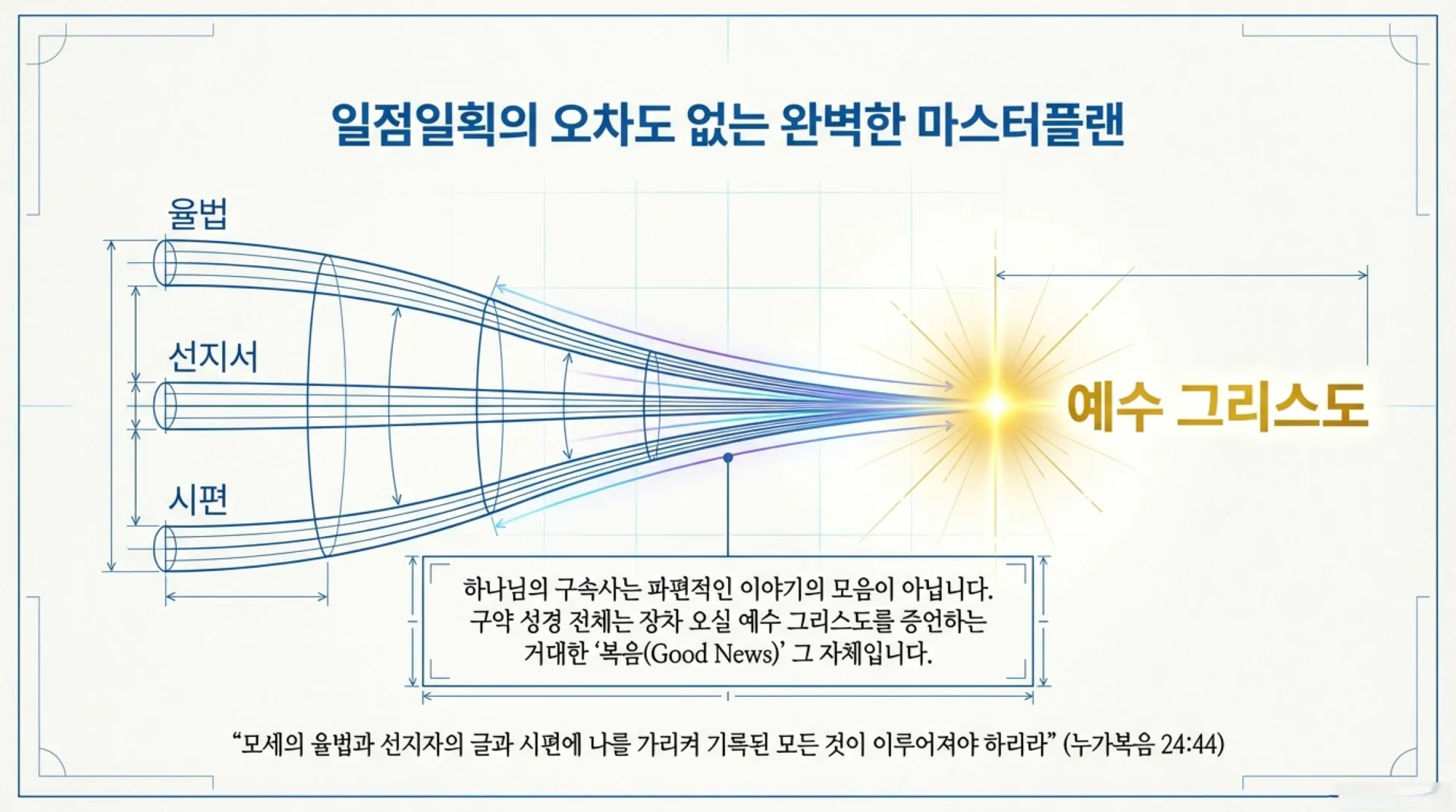 하나님의 구속사는 결코 파편적인 이야기들의 모음이 아니다. 창세기부터 요한계시록까지 일점일획의 오차도 없이 오직 한 분, '예수 그리스도'를 향해 정교하게 조준되어 있는 완벽한 마스터플랜(master plan)이다. 예수님은 친히 "모세의 율법과 선지자의 글과 시편에 나를 가리켜 기록된 모든 것이 이루어져야 하리라"(눅 24:44)고 선언하셨다. 즉, 구약 성경 전체가 곧 장차 오실 예수 그리스도를 증언하는 거대한 '복음(Good News)' 그 자체인 것이다.