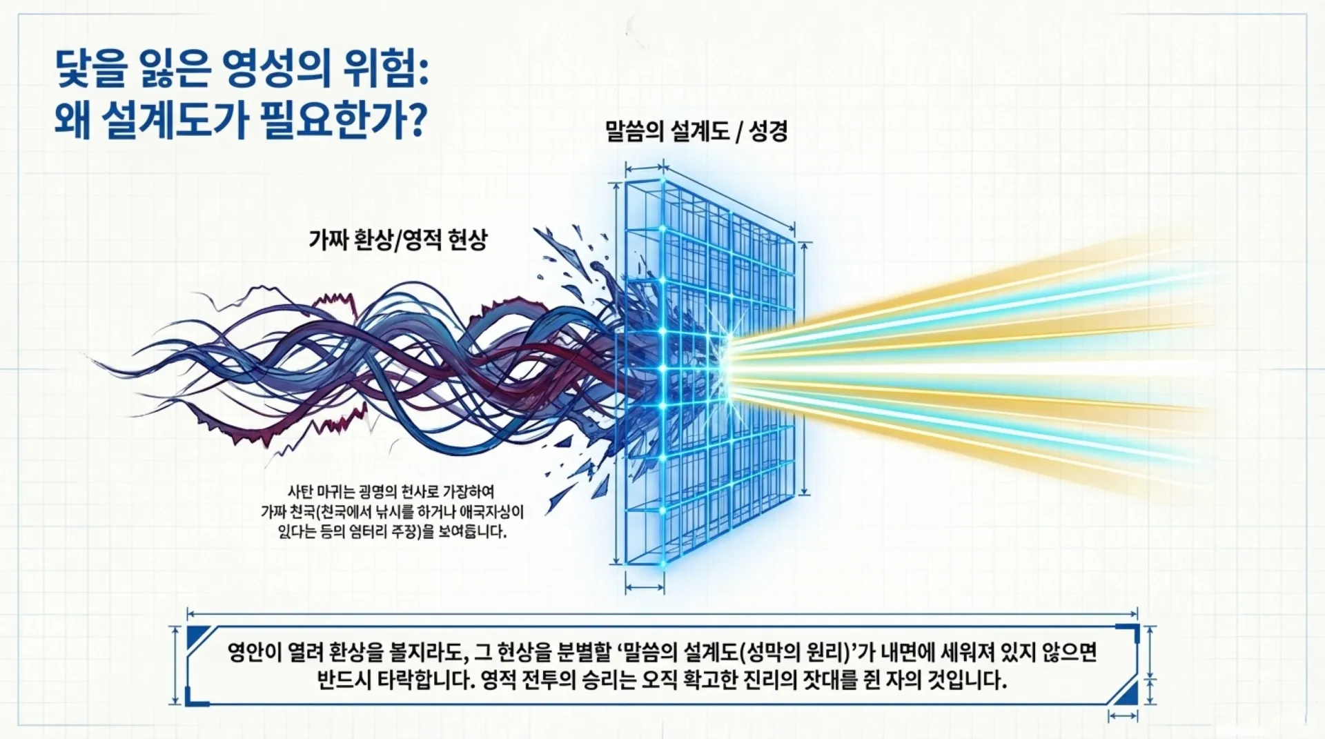 오늘날 은사를 사모하여 기도를 많이 하고 영안이 열려 귀신과 천사를 본다는 사역자들이 적지 않다. 그러나 그들 중 상당수가 이단으로 빠지거나 영적으로 타락하는 비극을 맞이한다. 그 이유는 영적 세계의 현상만 좇을 뿐, 그 현상을 검증하고 분별할 '말씀의 설계도(성경)'가 그들 내면에 탄탄하게 세워져 있지 않기 때문이다.