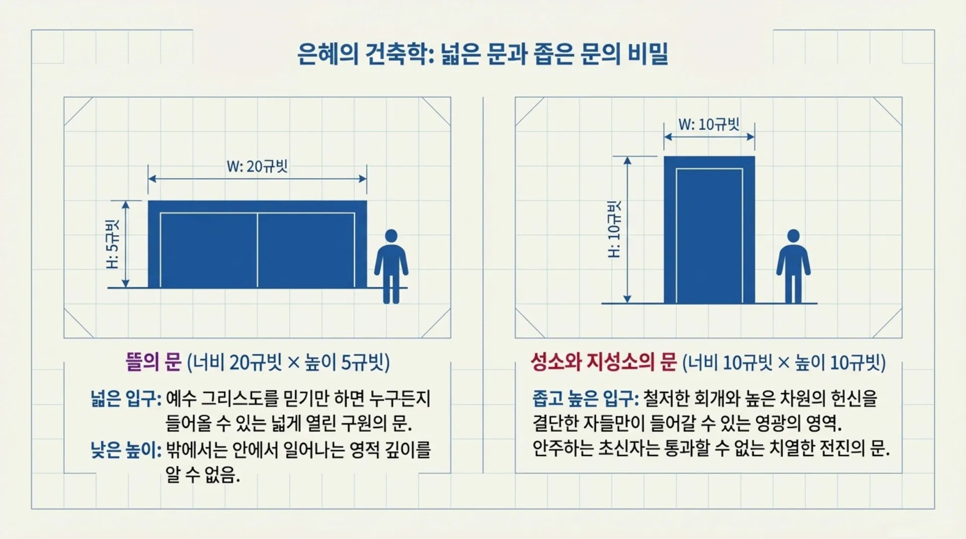 이는 영적으로 대단히 뼈저린 진리를 시사한다. 예수를 믿고 뜰 마당을 밟는 초신자의 문은 넓지만, 주님의 깊은 임재가 있는 성소와 지성소의 차원으로 들어가는 문은 아무나 쉽게 통과할 수 없는 '좁고 높은 문'이라는 것이다. 그곳은 철저한 회개로 세속의 때를 벗겨내고, 더 높은 차원의 헌신과 거룩함을 결단한 자들만이 들어갈 수 있는 영광의 영역이기 때문이다. 오늘날 수많은 교인이 넓고 편한 뜰의 문만 통과한 채 구원받았다고 안주하지만, 천국의 상급과 영광을 누리기 위해서는 반드시 더 좁고 높은 성소의 문을 향해 치열하게 전진해야만 한다.