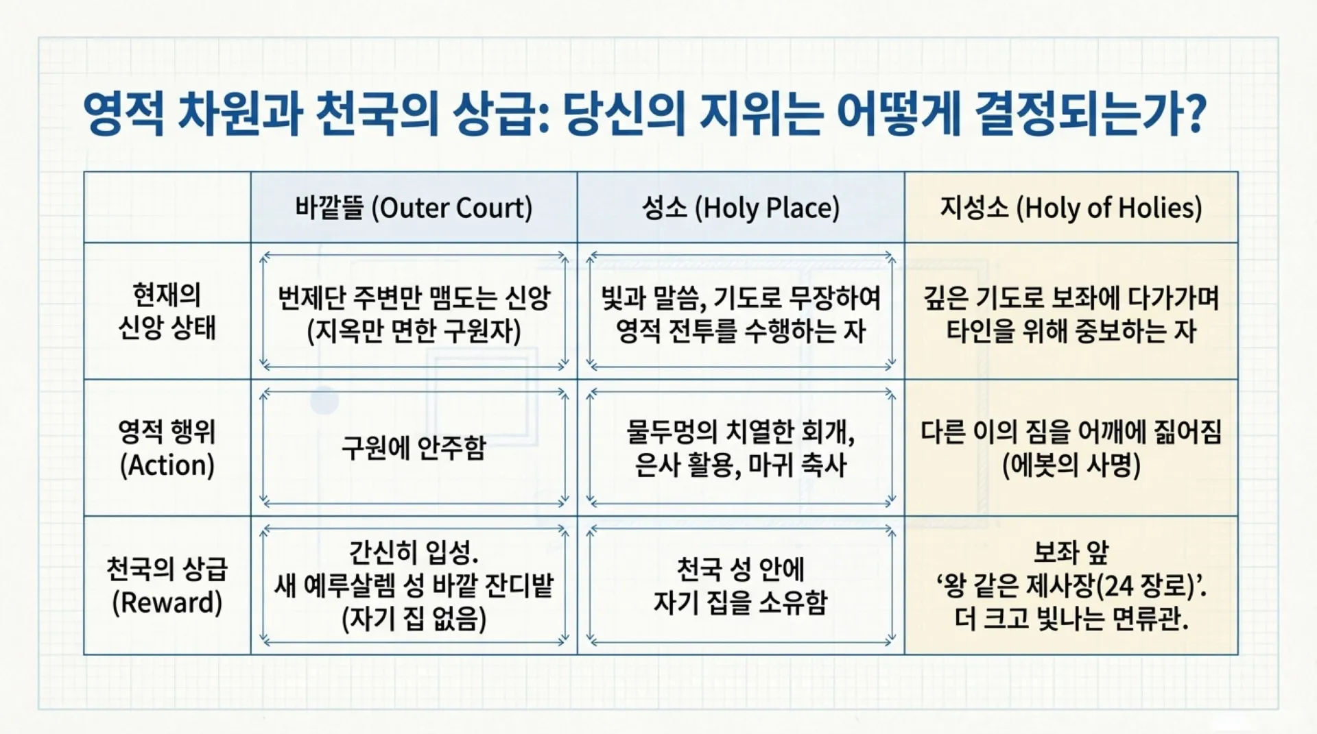 8. 번제단에만 머무는 백성과 물두멍을 거쳐 성소, 지성소까지 들어가는 제사장의 차이는, 훗날 천국에서 우리의 신분과 지위를 어떻게 갈라놓는가?