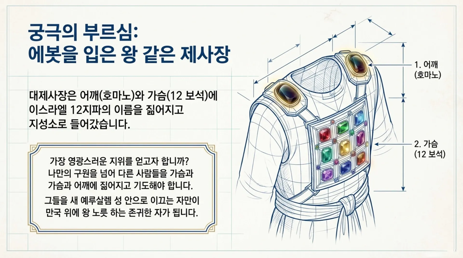이 설교는 성막에 계시된 예수 그리스도의 모형과 예표를 통해 성경 전체를 관통하는 하나님의 구원 경륜을 설명합니다. 정보배 목사는 구약의 성막이 단순한 역사적 건물이 아니라 그리스도의 인격과 사역을 보여주는 정교한 설계도이며, 이를 올바르게 깨달을 때 비로소 성도가 영적 전쟁에서 승리하고 천국의 지위를 확보할 수 있음을 강조합니다. 특히 성막의 각 문과 기구들이 지닌 청색, 자색, 홍색, 백색의 색상은 예수님의 신성과 왕권, 희생과 순결을 상징하는 복음서의 핵심 메시지와 연결됩니다. 결론적으로 이 설교는 성도들이 철저한 회개와 영적 지각의 회복을 통해 성막의 바깥뜰을 넘어 지성소에 계신 하나님께로 더 가까이 나아가는 장성한 분량의 신앙을 가질 것을 독려합니다.