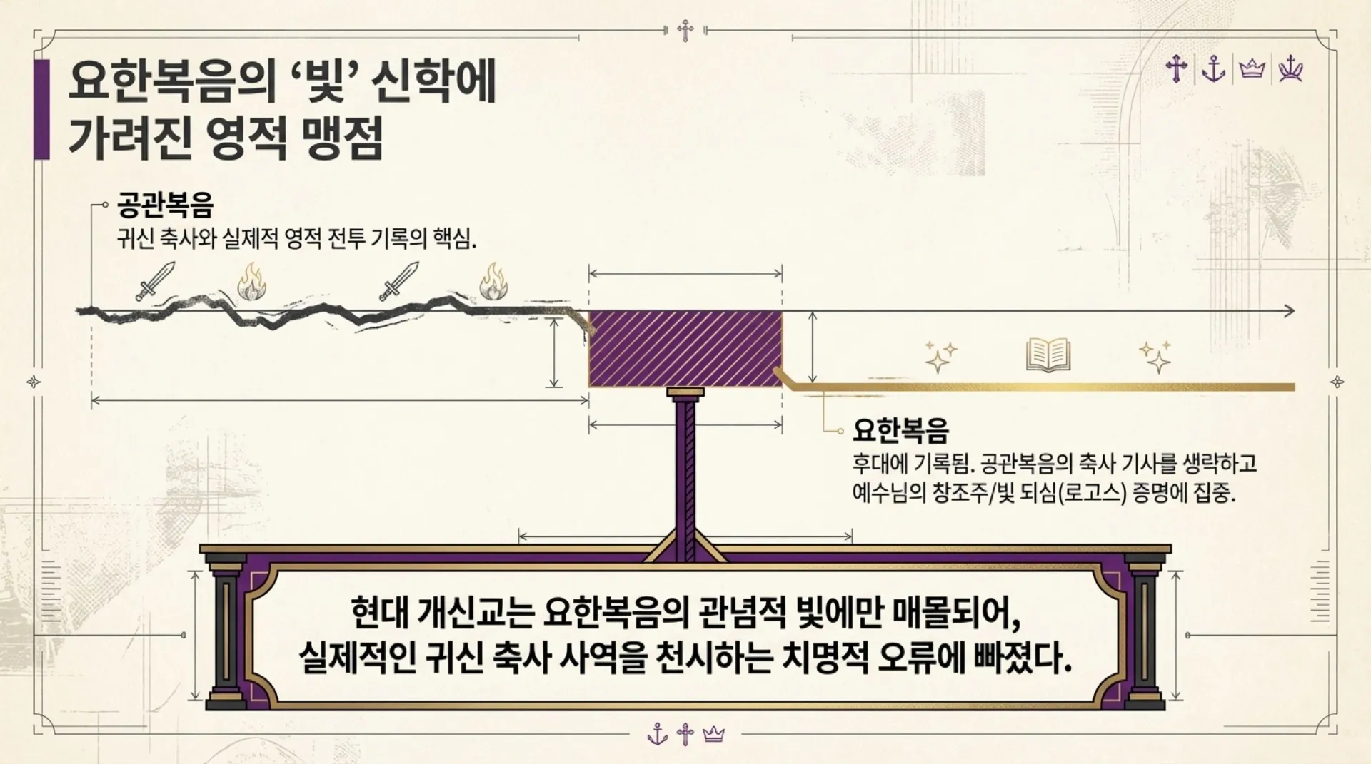 그러나 이 역사적 배경을 모르는 현대의 수많은 신학자와 교인들은 치명적인 맹점에 빠져버렸다. 요한복음의 관념적이고 철학적인 '빛과 로고스' 신학에만 매몰된 나머지, 예수님이 3년 반 동안 피 튀기며 싸우셨던 '마귀와 귀신을 쫓아내는 실제적인 영적 전투'를 저급하고 무속적인 것으로 천시하게 된 것이다. 이것이 오늘날 개신교 강단에서 귀신 쫓는 사역이 사라지게 된 가장 뼈아픈 원인 중 하나라고 하겠다.