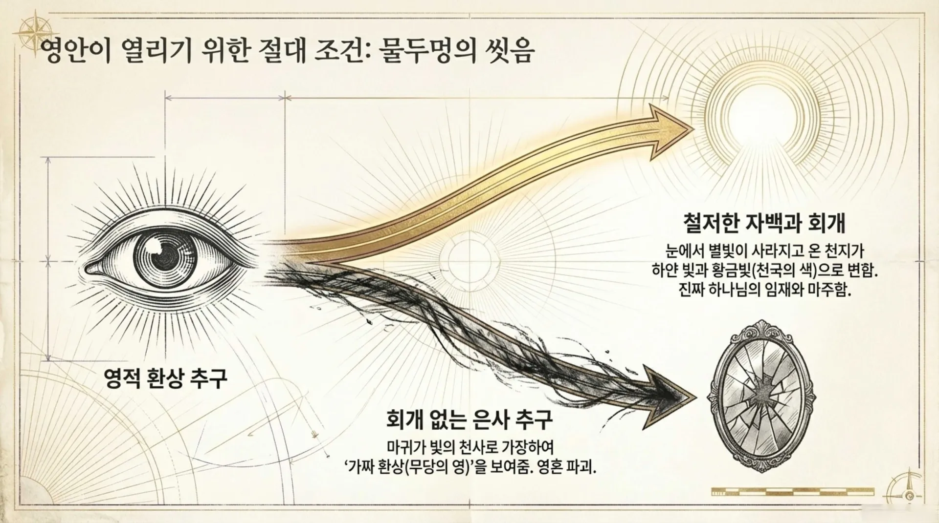 7. 영안이 열려 천국의 빛과 실상을 온전히 보기 위해, 사역자나 성도가 철저한 회개(물두멍의 씻음)를 거치지 않았을 때 겪게 되는 영적 착각과 위험성은 무엇인가?