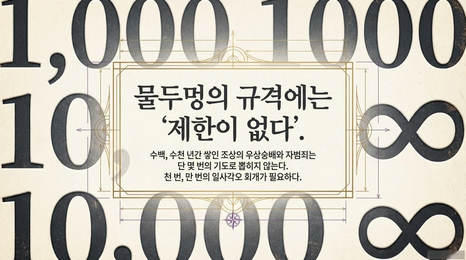 그럼, 어떻게 해야 항상 불이 활활 잘 타오르게 할 수 있는가? 그것은 물두멍의 규격에는 '제한이 없다'는 사실을 주목해야 한다. 아니 그것을 뼈저리게 명심해야 한다. 자기가 혹시 회개기도문을 가지고 150번 정도 회개했다고 해서 어둠이 다 쫓겨나가는 것은 아니다. 어떤 이는 자기 조상들이 지은 죄에 따라서 몇 달과 몇 년을 회개해야 할지 잘 모른다. 조상 대대로 500년, 1,000년 동안 쌓아온 끔찍한 우상 숭배로 인하여 들어온 영들을 어찌 단 몇 번의 기도로 뽑아낼 수 있겠는가! 천 번, 이천 번, 만 번이라도 회개함으로 악한 영들을 다 제거하겠다는 일사각오의 자세로 회개를 해야 한다. 정말 자기의 몸에서 악한 영을 실 오라기 하나 없이 제거하겠다는 자세로 회개해야 한다. 그런 자에게 성소의 빛의 능력이 나타나게 되는 것이다.
