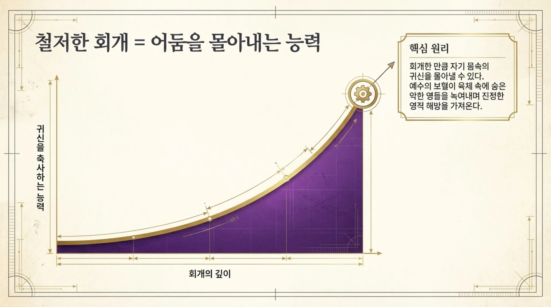 예수님은 빛이시요, 성령의 불이시다. 우리가 그 빛을 내 안에 모셔 들였다면, 내 몸과 영혼 구석구석에 진을 치고 있는 '어둠의 세력(귀신들)'은 당연히 비명을 지르며 쫓겨나가야 마땅하다. 그런데 오늘날 수많은 교인이 입술로는 "나는 빛 가운데 있다, 성령의 인도를 받는다"고 말하면서도, 정작 자기 몸속에 자리잡고 있는 가난의 영, 질병의 영, 혈기의 영들을 몰아내는 '축사(逐邪)'사역은 거부한다. 그러나 빛을 비추어 어둠을 몰아내는 치열한 영적 전투 없이, 관념적으로만 빛을 소유했다고 생각하는 것은 새빨간 거짓말이요 반쪽짜리 복음이다. 왜냐하면 내 안의 어둠(귀신)을 쫓아내지 않는 한, 우리는 결코 성소의 참된 빛과 생명을 온전히 누릴 수 없기 때문이다.