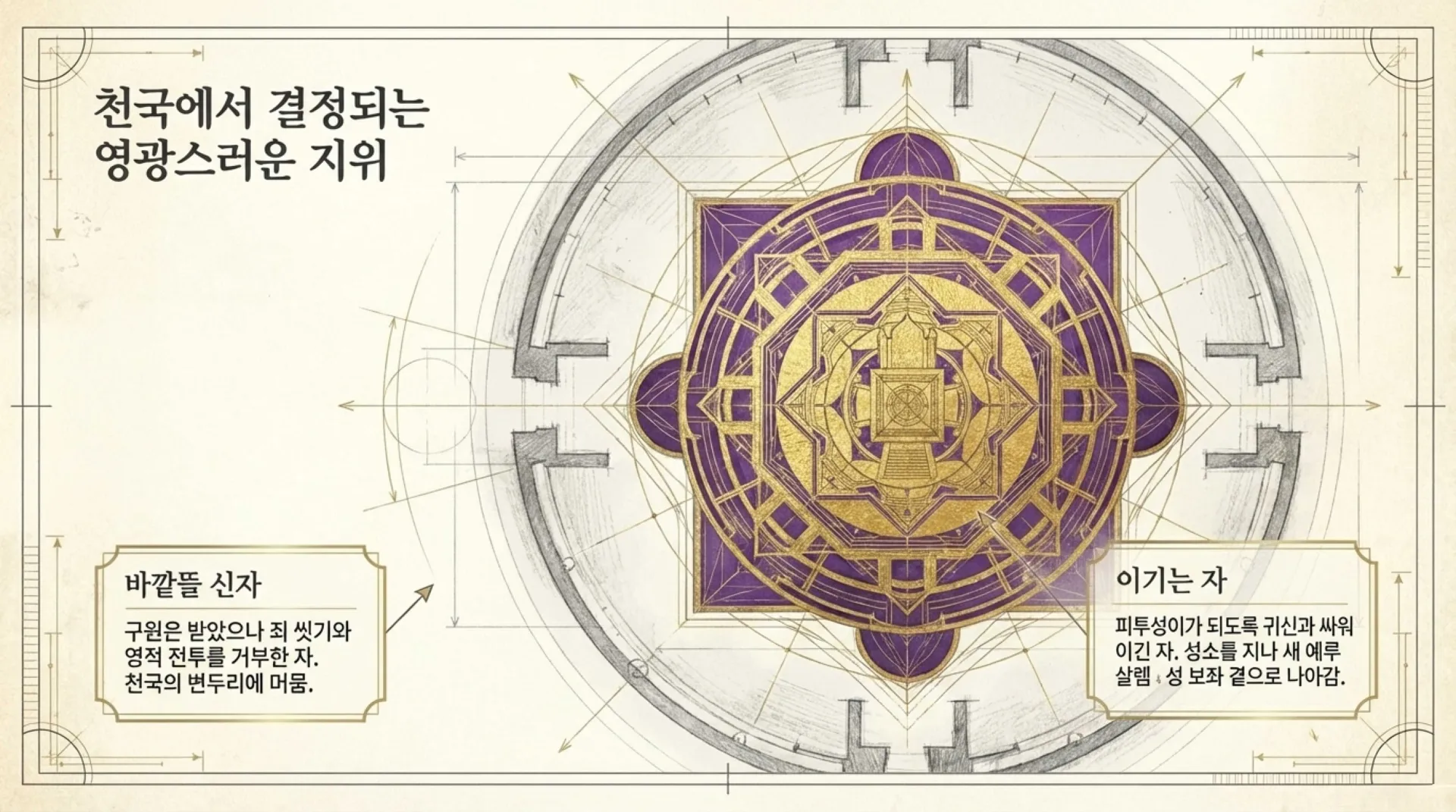 이는 영적으로 대단히 뼈저린 진리를 시사한다. 번제단(칭의)을 통과한 성도라 할지라도 모두가 주님의 깊은 임재가 있는 성소에 들어갈 수 있는 것은 아니기 때문이다. 이는 성소로 나아가는 길은 좁고 협착하며, 이전보다 훨씬 더 '높은 차원의 영적 헌신과 거룩함'을 요구하기 때문이다. 물두멍에서 자신의 죄와 어둠을 철저히 씻어내는 제사장들만이 이 좁고 높은 문을 통과하여 떡상의 양식과 등잔대의 빛을 누리는 특권을 얻는 것이다. 구원받았다는 얄팍한 안도감에 취해 바깥뜰만 밟고 돌아가는 자는, 결코 천국에서 보좌에 더 가까이 나아가는 영광의 지위를 얻을 수 없다.