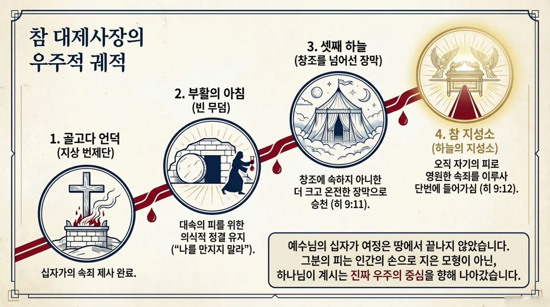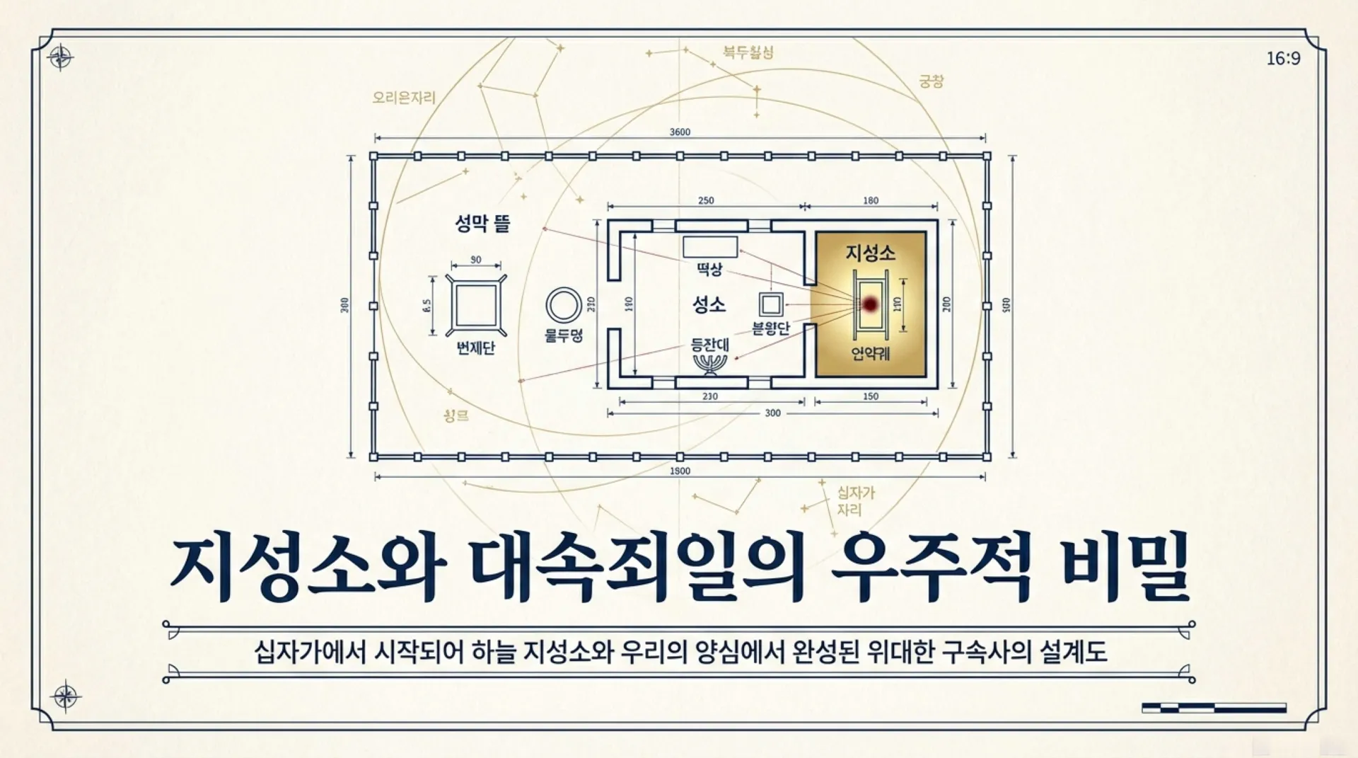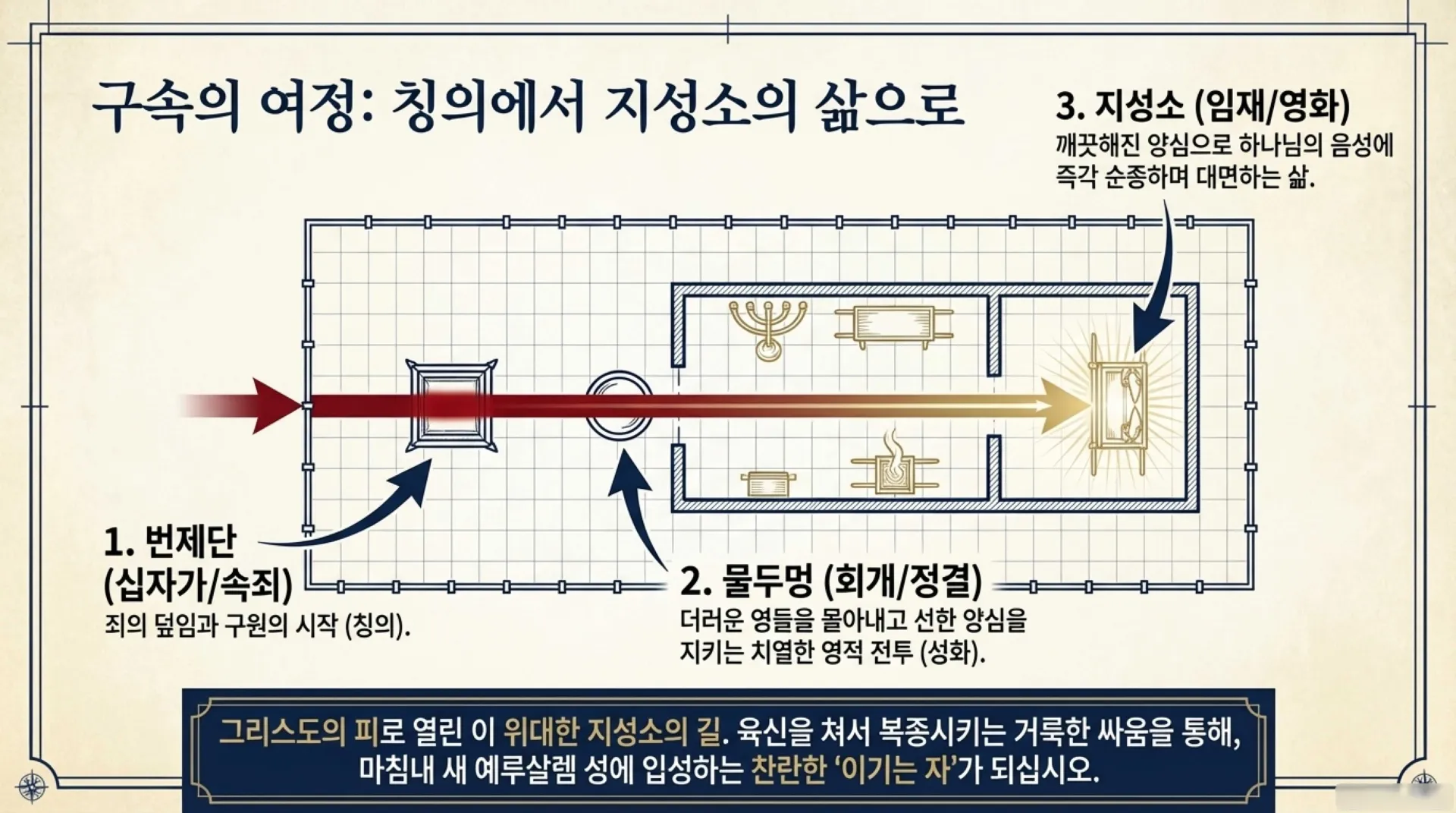 우리가 믿는 예수 그리스도의 십자가 대속은 인류 구원 역사상 가장 위대하고도 신비로운 사건이다. 구약의 성막은 이 위대한 구속사의 여정을 정확하게 계시하는 완벽한 설계도다. 성막 바깥뜰에 있는 번제단은 인간의 죄를 피로 덮어주는 '속죄(Covering)'의 장소요, 물두멍은 그 더러움을 씻어내는 '정결(Cleansing)'의 장소다. 그리고 이 과정을 통과한 대제사장이 마침내 도달하는 지성소는, 빛이신 하나님 아버지의 영광(Shekinah)이 가득한 거룩한 임재의 처소다.
