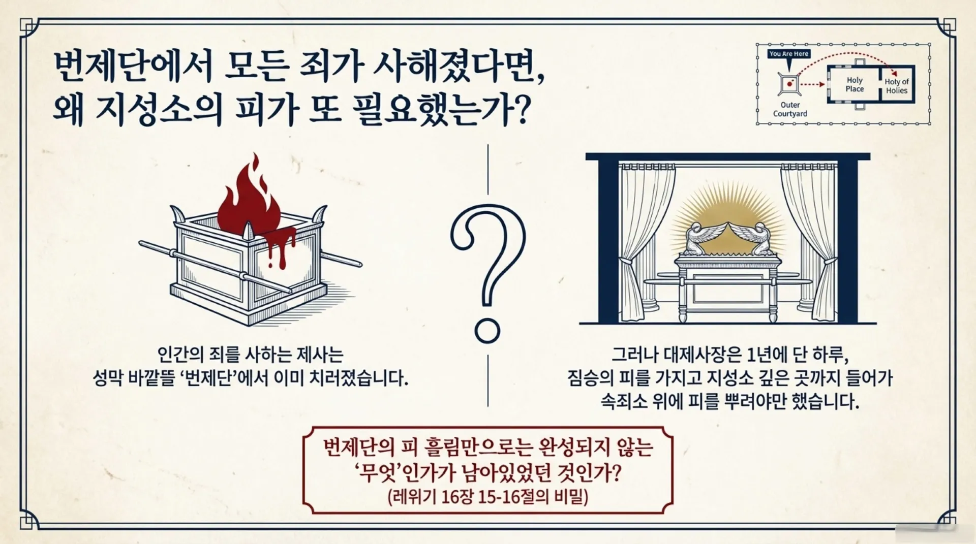 2. 지성소는 하나님의 거룩한 임재가 가득한 곳인데, 왜 1년에 한 번 대제사장이 피를 뿌리는 대속죄일 제사가 필요했는가?