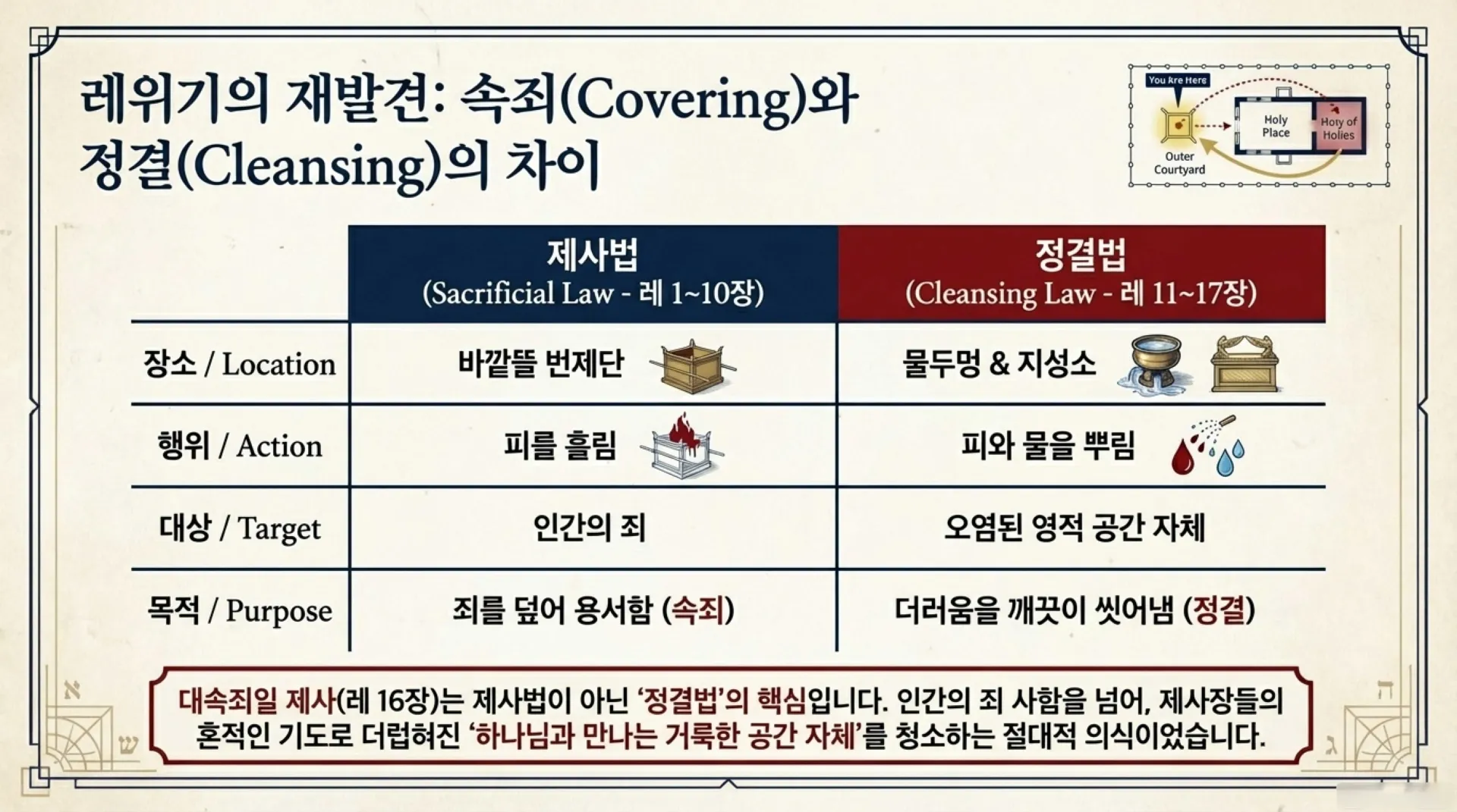 구약의 레위기는 제사법(1~10장)과 정결법(11~17장), 그리고 성결법(18~27장)으로 나뉜다. 대속죄일 제사가 기록된 레위기 16장은 인간의 죄를 사하는 제사법이 아니라, 더러워진 것을 씻어내는 '정결법'의 핵심에 위치해 있다. 번제단에서 피를 흘려 인간의 죄를 덮는 것이 '속죄'라면, 피와 물을 뿌려 오염된 대상을 깨끗하게 씻어내는 것은 '정결'이다.