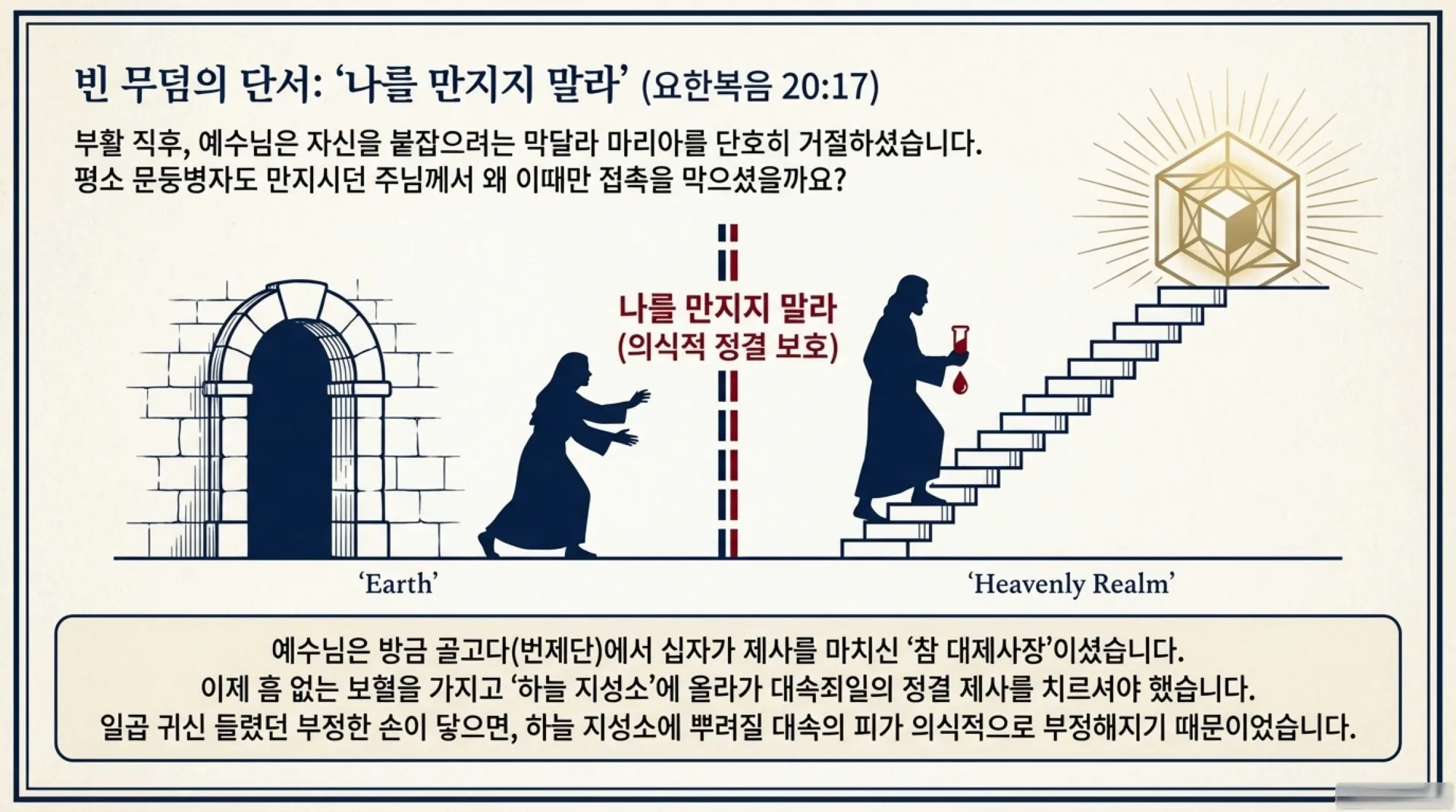 그 이유는 단 한 가지다. 예수님은 사실 골고다 언덕(번제단)에서 십자가의 속죄 제사를 막 끝내시고 부활하신 참된 대제사장이셨다. 이제 대제사장이신 주님께서는 당신의 흠 없는 보혈을 가지고 '하늘의 지성소'로 올라가 대속죄일의 정결 제사를 온전히 치르셔야만 했다. 만약 과거 일곱 귀신들이 들렸던 마리아의 부정한 손이 그 거룩한 대제사장의 몸에 닿는다면, 하늘 지성소에 뿌려질 대속의 피가 부정하기 때문이었다. 그러므로 예수께서는 아버지의 보좌로 올라가 하늘 지성소에 피를 뿌려 대속죄일의 정결 의식을 완수하신 이후에, 비로소 다른 여인들과 도마가 당신의 몸을 만지는 것을 허락하신 것이다.