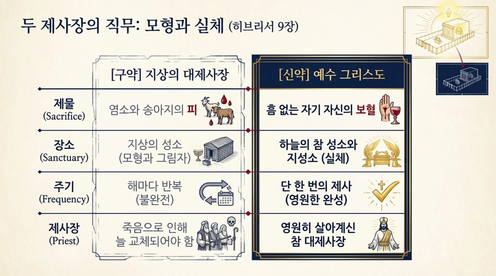 구약의 대제사장은 짐승의 피를 가지고 모형과 그림자에 불과한 지상의 성소들에 해마다 들어가서 지성소의 속죄소와 성소의 분향단을 정결케 해야 했지만, 영원한 대제사장이신 예수님은 당신의 거룩한 피를 가지고 실체인 하늘의 성소와 지성소로 직접 들어가신 것이다. 그리고 단 한 번의 제사로서 온 인류의 완전한 속죄와 정결을 영원히 완성하신 것이다. 이것이 바로 우리가 믿는 예수 그리스도의 위대한 피의 효력이다.