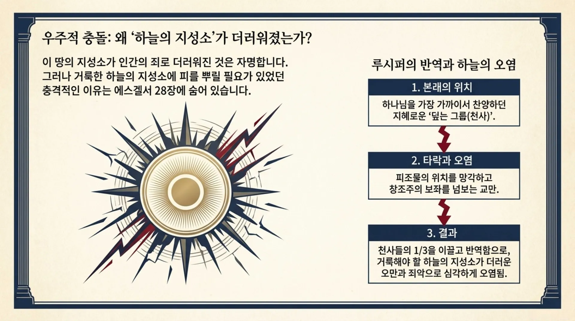 그렇다면 여기서 궁극적인 의문이 생긴다. 이 땅의 지성소가 인간의 죄로 더러워진 것은 이해할 수 있으나, 어찌하여 거룩한 '하늘의 지성소'에 피를 뿌려 정결하게 할 필요가 있었던 것인가? 그 충격적인 대답은 에스겔서에 기록된 사탄 마귀(루시퍼)의 타락 과정에 숨어 있다.