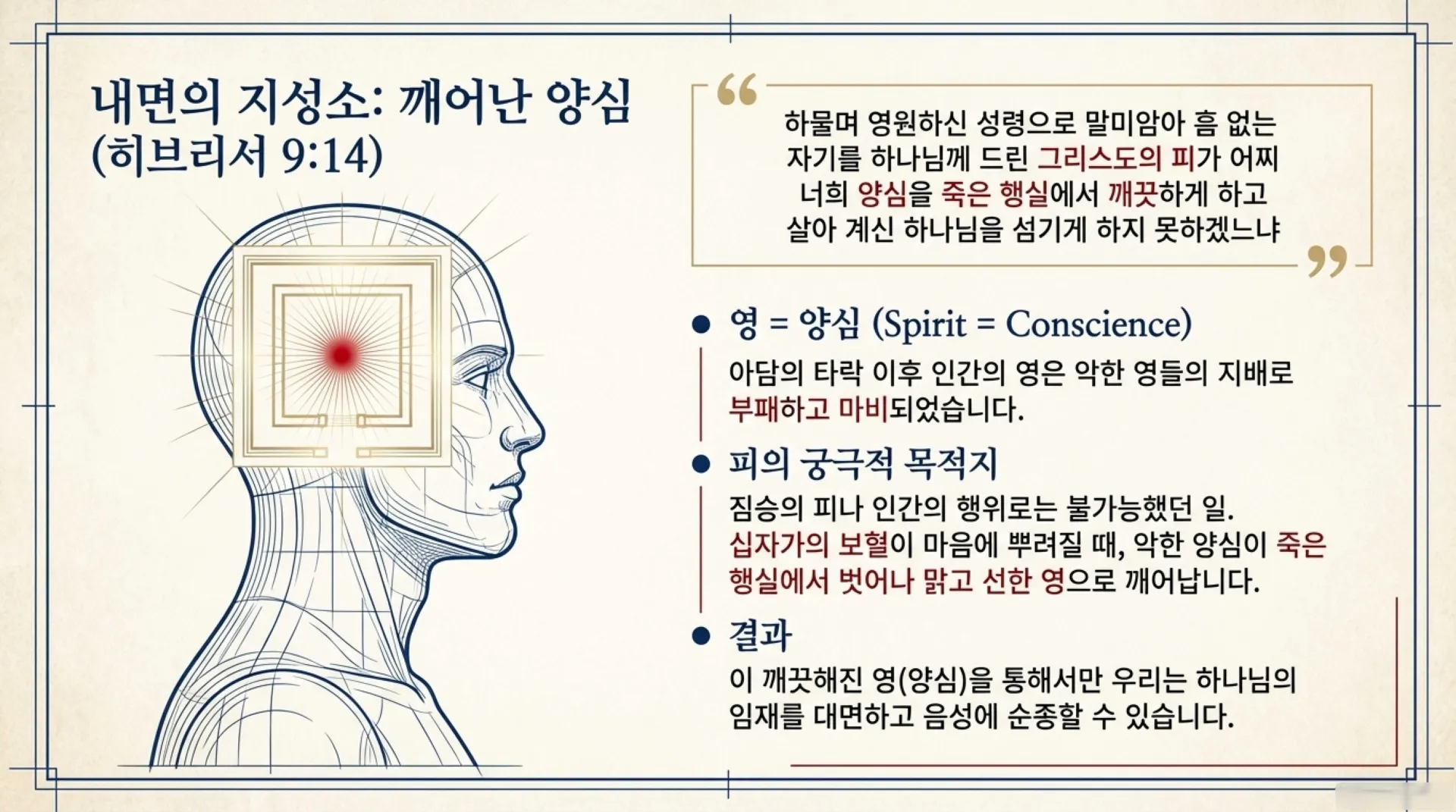 그렇다. 사도 바울의 증언처럼 우리의 영이 곧 양심이다(롬 1:9, 행 23:1). 아담의 타락 이후 우리의 영(양심)은 악한 영들의 지배와 죄악으로 인해 심각하게 더럽혀지고 마비되어 있었다(엡 2:1). 그러므로 인간의 그 어떤 행위나 짐승의 피를 가지고서는 이 더럽혀진 양심을 결코 정결하게 할 수 없었다. 그러나 십자가에서 흘리신 예수의 피가 우리 마음에 뿌려질 때, 우리의 악한 양심은 비로소 죽은 행실에서 벗어나 맑고 선한 양심(영)으로 깨어나게 된다. 이 깨끗해진 영을 통해서만이 우리는 비로소 하나님의 깊은 임재를 대면하여 보고, 그분의 음성에 순종하는 지성소의 삶을 살아갈 수 있는 것이다.