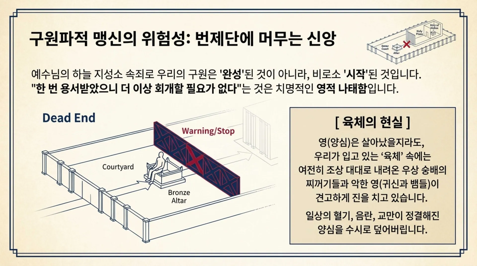 예수께서 대제사장이 되시어 당신의 피를 가지고 하늘 지성소에 들어가 속죄하심으로 우리의 양심을 깨끗하게 했다면, 이제 우리의 구원은 완전히 끝난 것인가? 그러나 결코 그렇지 않다. 왜냐하면 우리의 구원은 예수님의 속죄로 인하여 이제 비로소 시작된 것이지 완성된 것이 아니기 때문이다. 그런데도 불구하고 오늘날 수많은 개신교인들은 여전히 "한 번 예수의 피로 내 죄를 용서받았으니 더 이상 회개할 필요가 없다"는 구원파적 맹신에 빠져 있다. 그러나 그때 우리의 영(양심)이 살아났을지라도, 우리가 입고 있는 육체 속에는 여전히 조상 대대로 내려온 우상 숭배의 찌꺼기들과 악한 영(귀신과 뱀들)이 견고하게 진을 치고 있음을 알아야 한다.