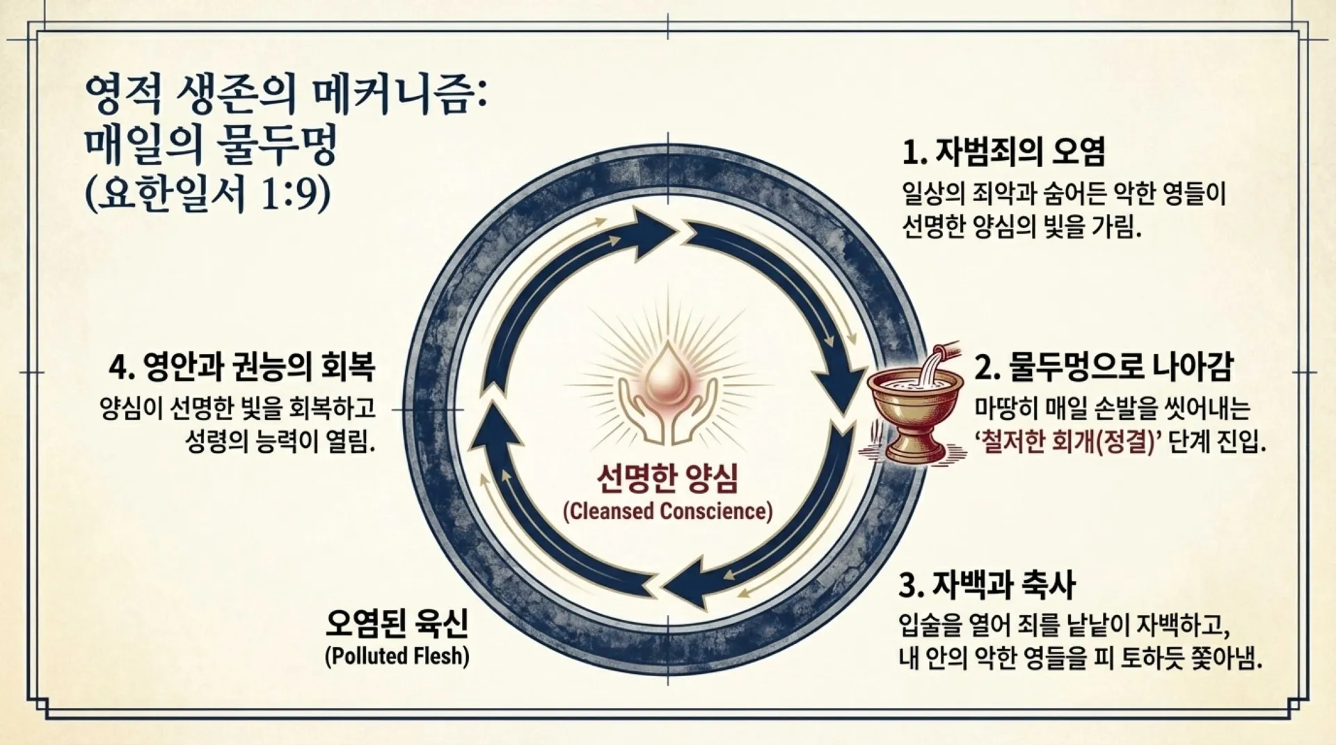 우리가 오늘도 일상에서 짓는 자범죄들 곧 혈기, 음란, 교만의 생각들은 정결해진 양심을 수시로 덮어버리고 다시 더럽힌다. 따라서 십자가의 보혈(속죄)을 믿어 영이 구원을 받았다면, 그는 마땅히 성막의 물두멍으로 나아가 매일매일 자신의 손발을 씻어내는 '철저한 회개(정결)'의 삶을 멈추지 말아야 한다. 입술을 열어 죄를 낱낱이 자백하고 내 안에 숨어 들어온 악한 영들을 피 토하듯 쫓아낼 때, 비로소 우리의 양심은 선명한 빛을 회복하고 성령께서 주시는 영안과 권능이 활짝 열리게 되기 때문이다. 회개 없는 은사나 영적 체험은 무당의 영이 주는 거짓 환상에 속아 넘어가기 십상이라는 사실을 뼛속 깊이 명심해야 한다.
