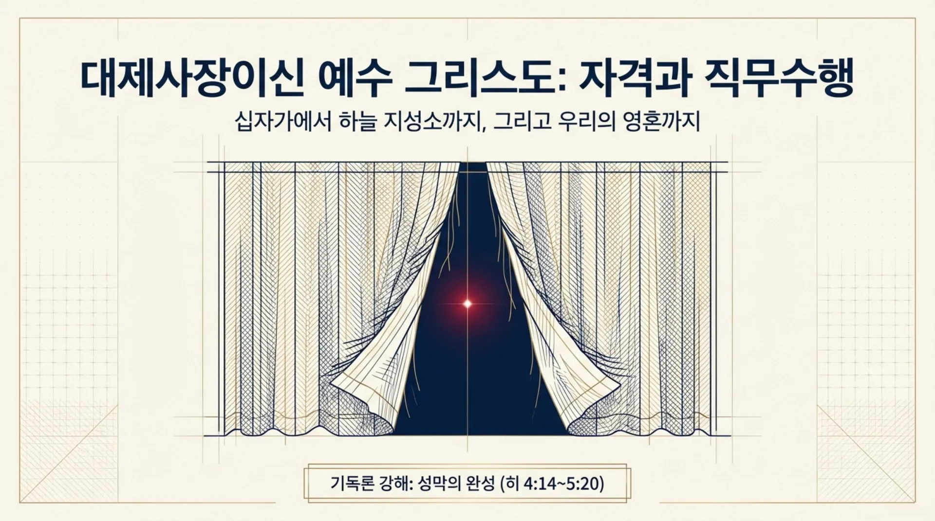 이제 성막이라는 거룩한 공간에 대한 이해를 바탕으로, 그 성막 안에서 피 흘려 제사를 집례하는 위대한 사역자, 즉 대제사장이신 예수 그리스도의 본질 속으로 들어가고자 한다. 성막은 제사장이 없이는 결코 그 구속의 기능이 발동될 수 없는 곳이다. 구약의 아론이 이스라엘 민족만을 위한 한시적인 대제사장이었다면, 우리 주 예수 그리스도는 온 인류의 죄를 영원히 씻어내신 인류의 참된 대제사장이시다. 그래서 이번 시간에는 십자가에서 죽으신 예수님이 왜 부활하신 후에 하늘로 올라가셔야만 했는지, 그리고 대제사장으로서 하늘 지성소에서 완수하신 그 위대한 직무가 우리의 영혼에 어떤 기적을 일으키게 되었는지까지를 깊이 있게 들여가보기로 하자.