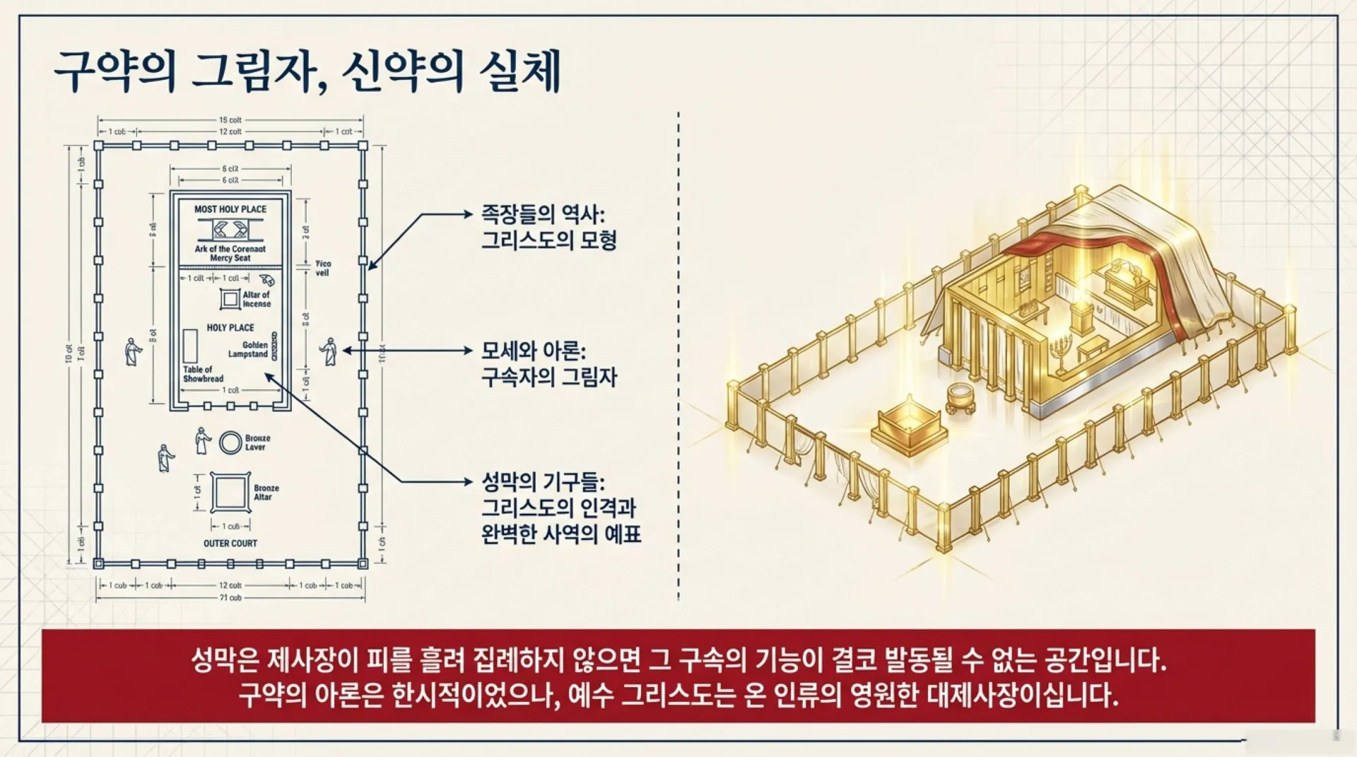 우리는 지금까지 기독론 강해를 통해 구약 성경에 계시된 예수 그리스도의 웅장한 발자취를 추적해 왔다. 창세기에 나타난 족장들의 개인과 가족사 속에서 그리스도의 모형을 발견했고, 출애굽기에 이르러서는 모세와 아론을 통해 이스라엘 민족 전체를 구원하시는 구속자의 그림자를 확인했다. 나아가 성막의 세밀한 기구들인 번제단, 물두멍, 금 등잔대, 떡상, 분향단, 그리고 지성소의 법궤가 어떻게 예수 그리스도의 인격과 사역을 완벽하게 예표하는지 깊이 있게 살펴보았다.