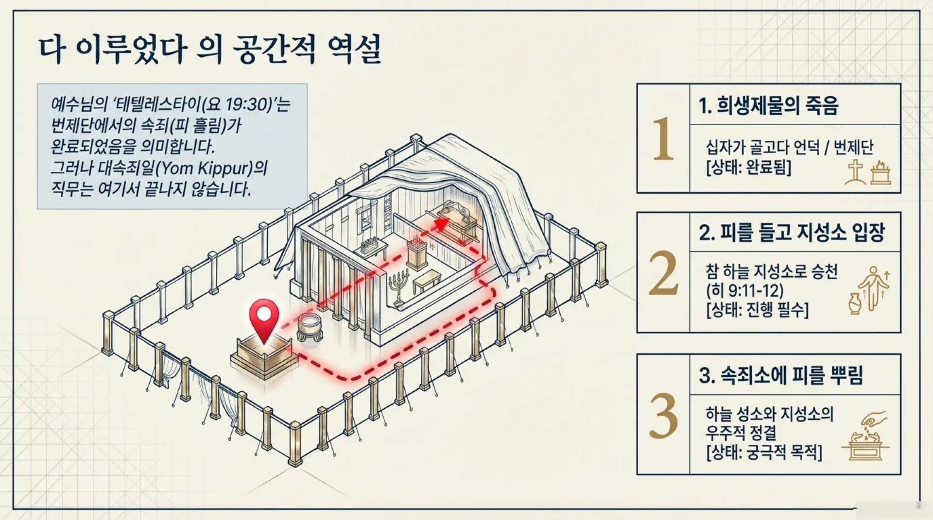 예수님은 골고다 언덕의 십자가 위에서 숨을 거두시며 "다 이루었다(그것이 이미 다 성취되었다)"고 선언하셨다(요 19:30). 헬라어 원문으로 '테텔레스타이(Tetelestai)'인 이 말씀은, 예수님이 인류의 죗값을 대신 치르기 위해 대속물로 자신을 내어주신 그 속죄의 사역이 완료된 채로 있다는 뜻이다. 즉 지상의 번제단에서 피를 흘려 우리의 죄를 덮는 속죄(카파르)의 사역은 십자가에서 완벽하게 끝이 난 것이다. 그러나 속죄(죄를 덮음)가 끝났다고 해서 대제사장의 모든 직무가 종료된 것은 결코 아니었다.
