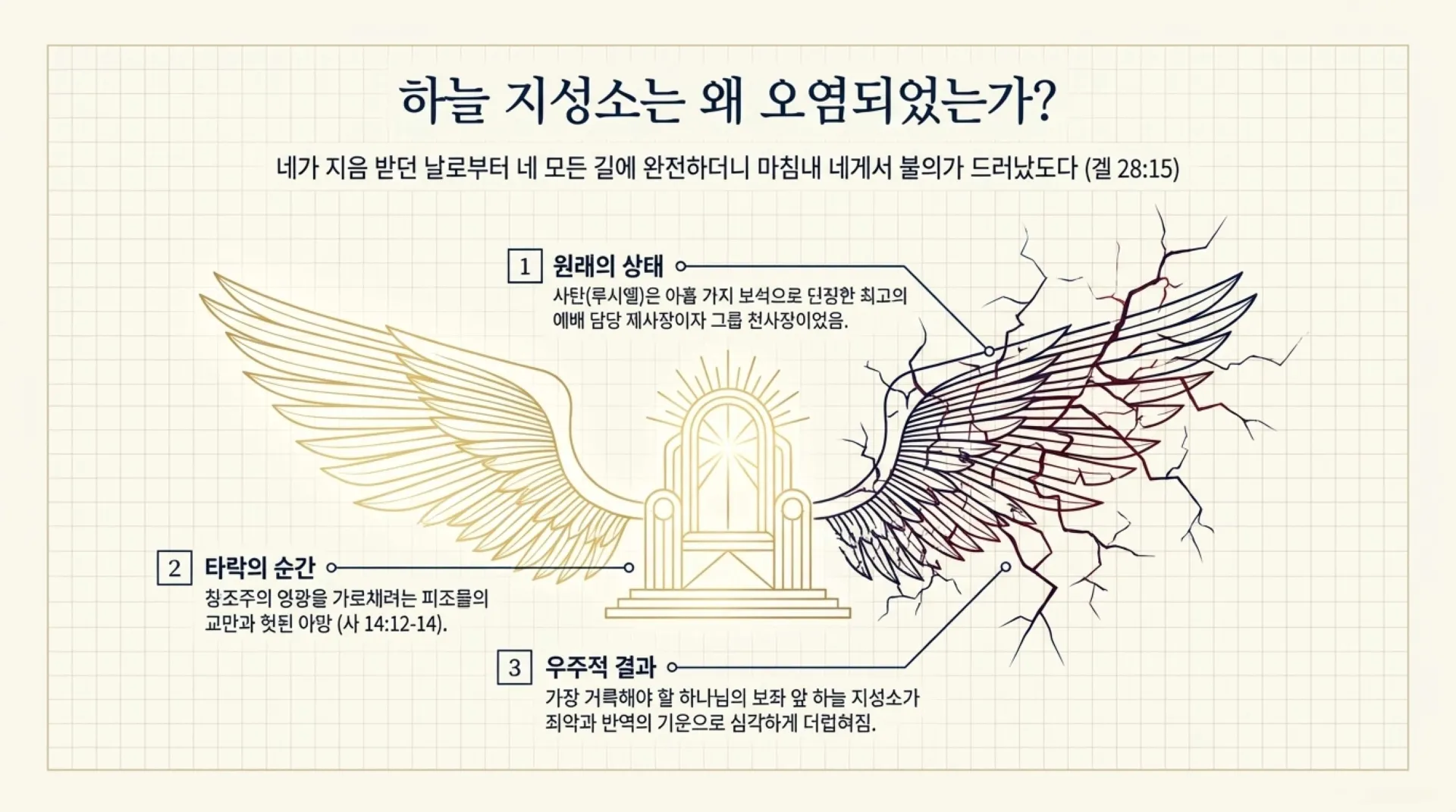 하나님은 지성소의 속죄소 위에 두 그룹 천사의 형상을 두게 하셨다. 이는 과거 하늘 보좌를 덮으며 영광을 호위하던 그룹 천사장들의 위치를 보여준다. 에스겔서의 기록에 따르면, 타락하기 전의 사탄(루시엘)은 아홉 가지 보석으로 단장하고, 소고와 비파를 연주하며 하나님의 거룩하심을 찬양하는 최고의 예배 담당 제사장이었다. 그러나 자신이 지닌 완벽한 아름다움과 지혜에 도취된 나머지, 창조주가 받으셔야 할 영광과 찬양을 자신이 가로채려는 교만에 빠지고 말았다(사 14:12-14). 가장 거룩해야 할 찬양이 피조물의 헛된 야망으로 인해 변질되었을 때, 하나님의 보좌 앞 지성소는 끔찍한 죄악과 반역의 기운으로 심각하게 더럽혀지고 말았던 것이다.