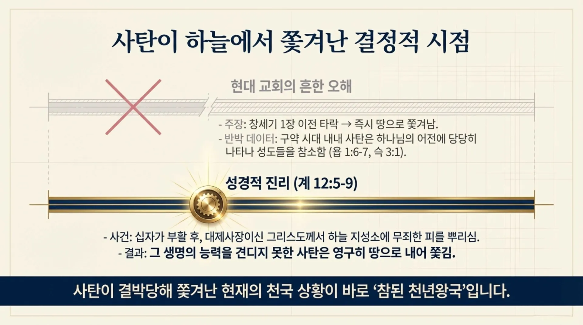 그렇다면 사탄 마귀가 하늘의 지성소에서 영원히 추방되어 땅으로 내어 쫓긴 결정적인 시점은 언제인가? 그것은 바로 부활하신 예수 그리스도께서 하늘 지성소에 올라가 거룩한 피를 뿌리신 대속죄일 제사의 직후다(계 12:5-9). 그리스도의 무죄한 피가 하늘 지성소에 덮었을 때, 그 거룩한 생명의 능력을 더 이상 견디지 못한 사탄과 그를 따르던 타락한 천사들(별들의 3분의 1)은 영영히 하늘에서 땅으로 내어 쫓기게 된 것이다. 그러므로 이 땅에 장차 지상 천년왕국이 이루어진다는 세대주의나 신천지 이단의 교리는 성경의 원문을 훼손한 심각한 오류다. 사탄이 땅으로 결박당해 쫓겨나고, 성도들이 하늘들에 올라가 거기서 살고 또한 왕 노릇 하고 있는 현재의 천국상황이 바로 참된 천년왕국임을 우리는 확신해야 한다.