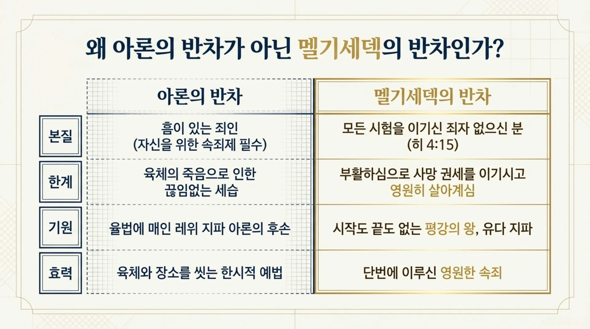 구약의 율법에 따르면 대제사장은 오직 레위 지파 아론의 후손만이 맡을 수 있었다. 그러나 히브리서는 유다 지파로 오신 예수님이 아론의 반차가 아닌 멜기세덱의 반차를 따르는 영원한 대제사장이심을 선언한다. 여기에는 인간 대제사장이 결코 극복할 수 없는 두 가지 치명적인 한계가 작용하기 때문이다.
