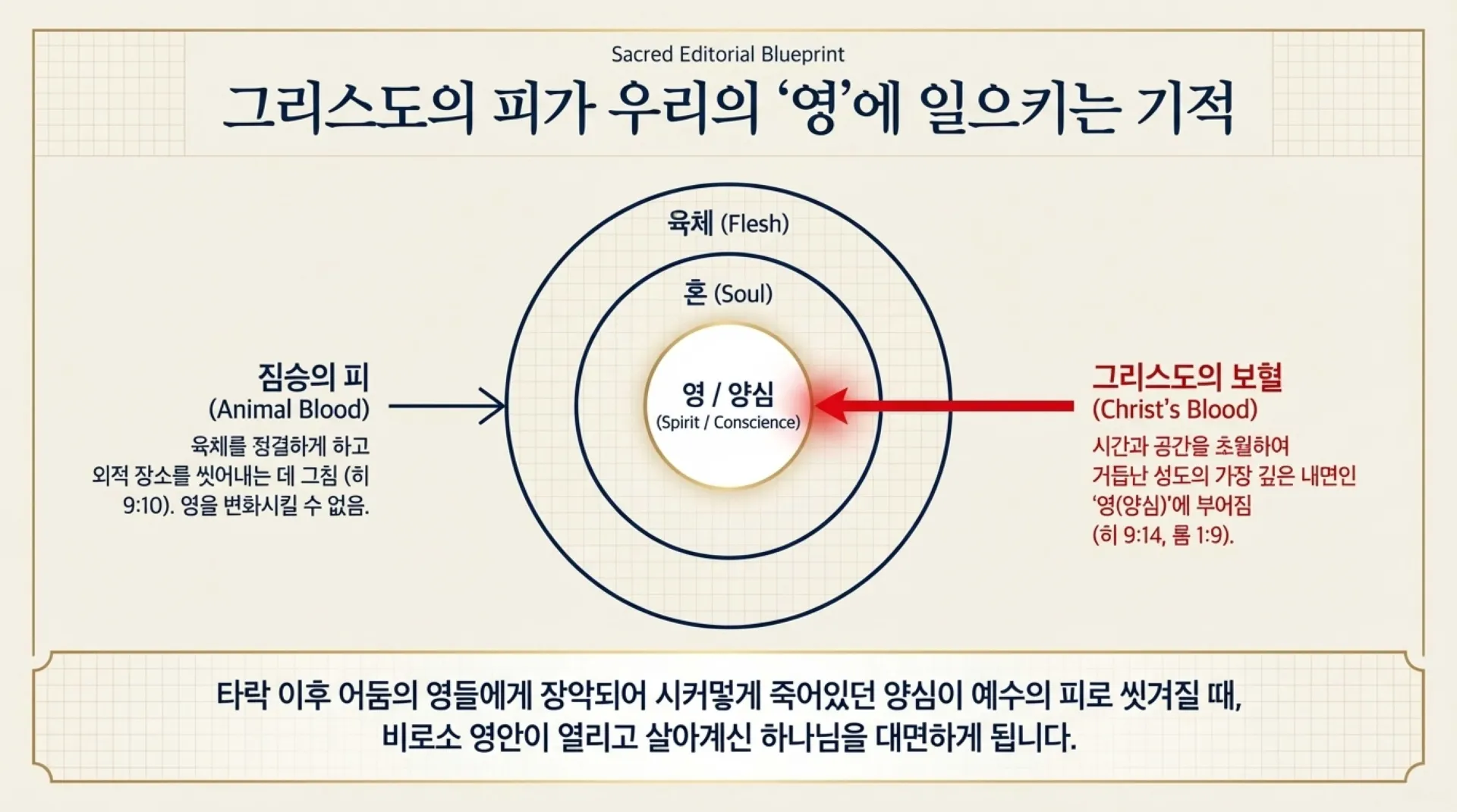 그러나 하늘로 올라가신 큰 대제사장 예수 그리스도께서 흠 없는 자기의 피를 하늘 지성소에 뿌리셨을 때, 그 거룩한 보혈의 능력이 시간을 초월하여 이 땅을 살아가는 거듭난 성도들의 영(양심)에 부어지는 놀라운 우주적 기적이 일어났다(히 9:14).